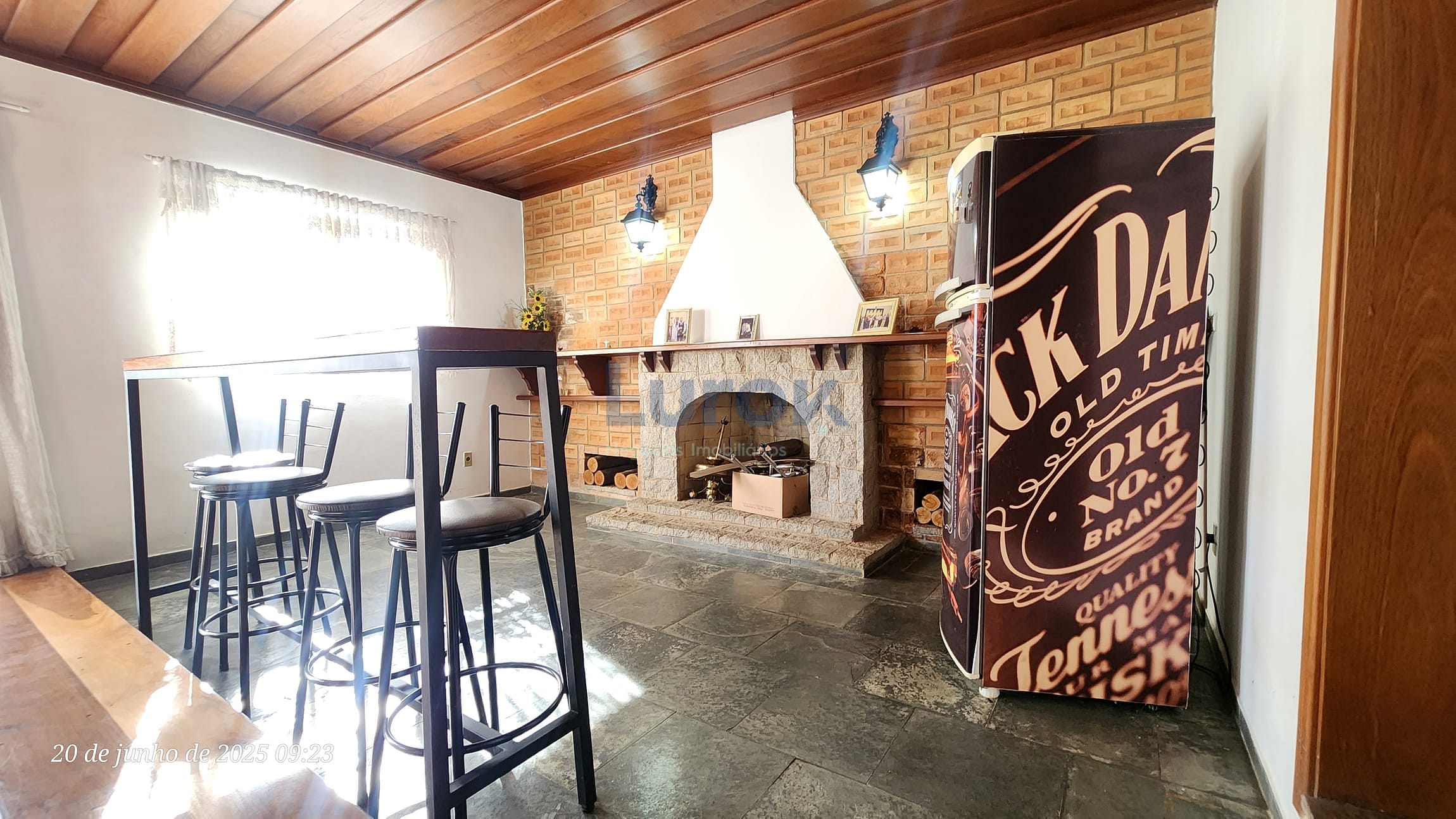 Sala ampla e arejada com charme de uma lareira.
