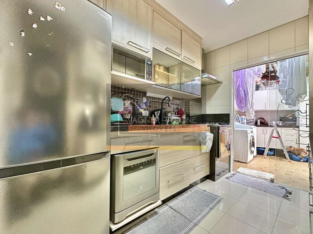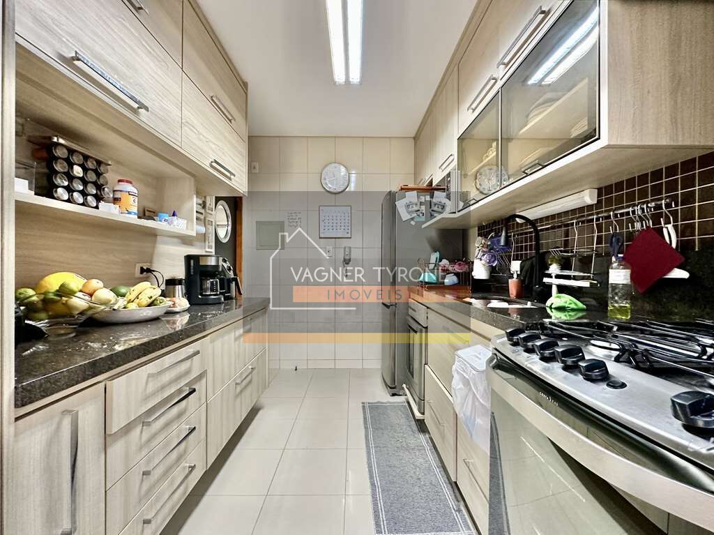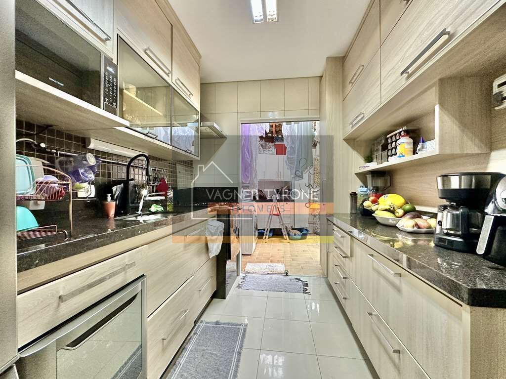 A cozinha planejada é funcional e bem equipada, com muitos armários, porta vai-e-vem com visor tipo escotilha, tampo em granito, pia inox e gabinetes. A lavanderia é fechada, planejada e repleta de armários, com tanque e bancada em granito.