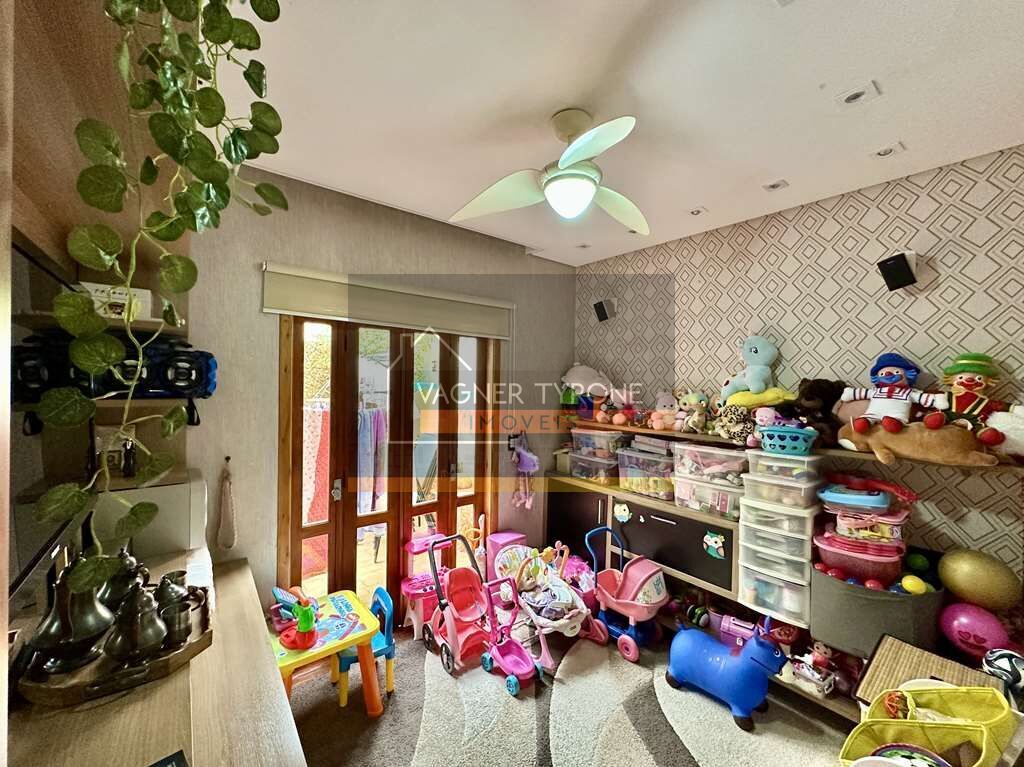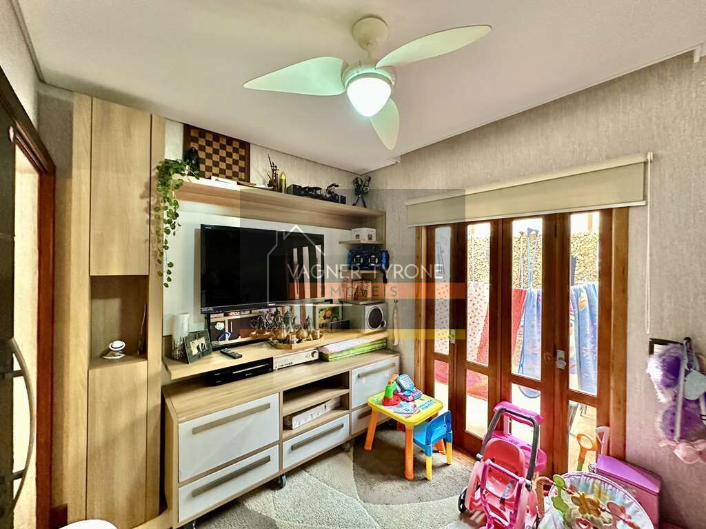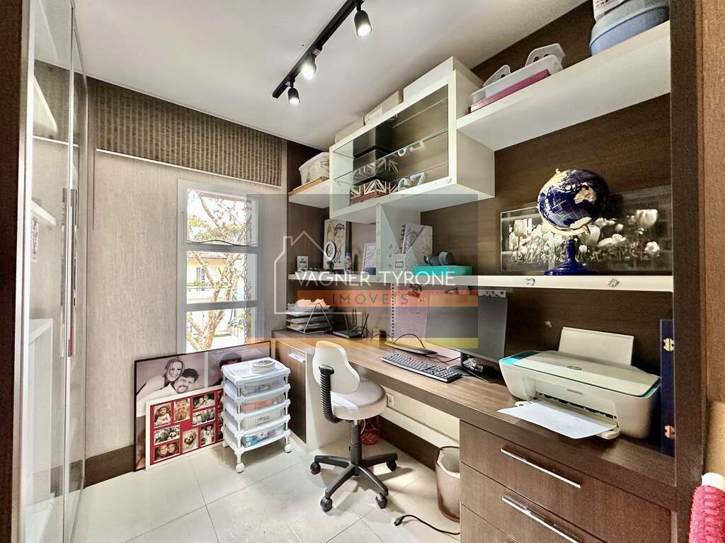 A casa conta ainda com uma sala íntima planejada, voltada para a varanda fechada, ideal para home theater ou espaço de música, com painel de TV, prateleiras e ventilador. A varanda integrada à área de serviço possui canteiros com plantas e é perfeita para um pequeno espaço gourmet com churrasqueira portátil.