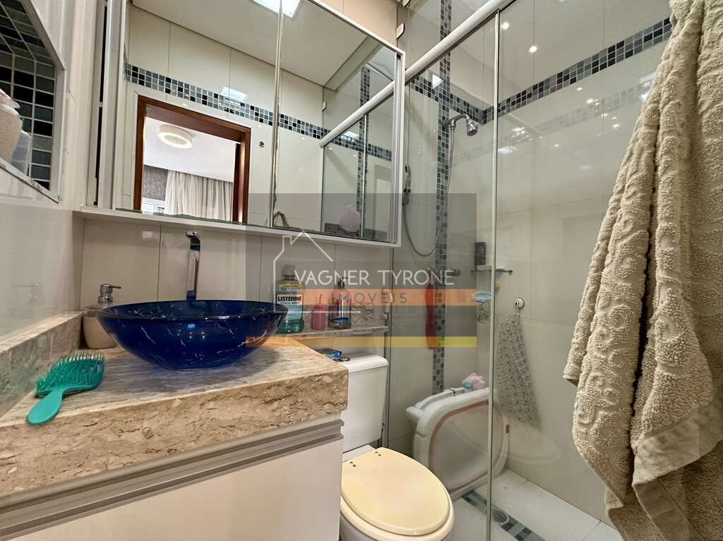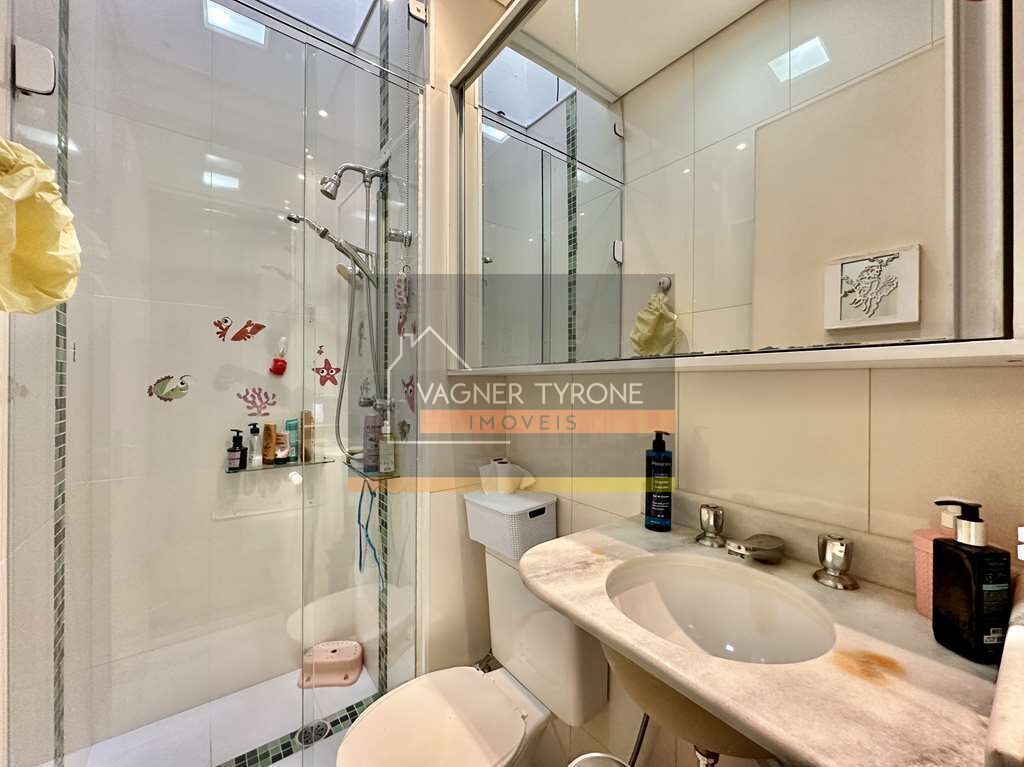 Os banheiros contam com claraboias, espelhos, gabinetes, tampos em Travertino, cubas de vidro e box de vidro até o teto.
