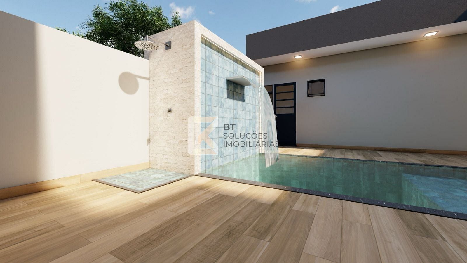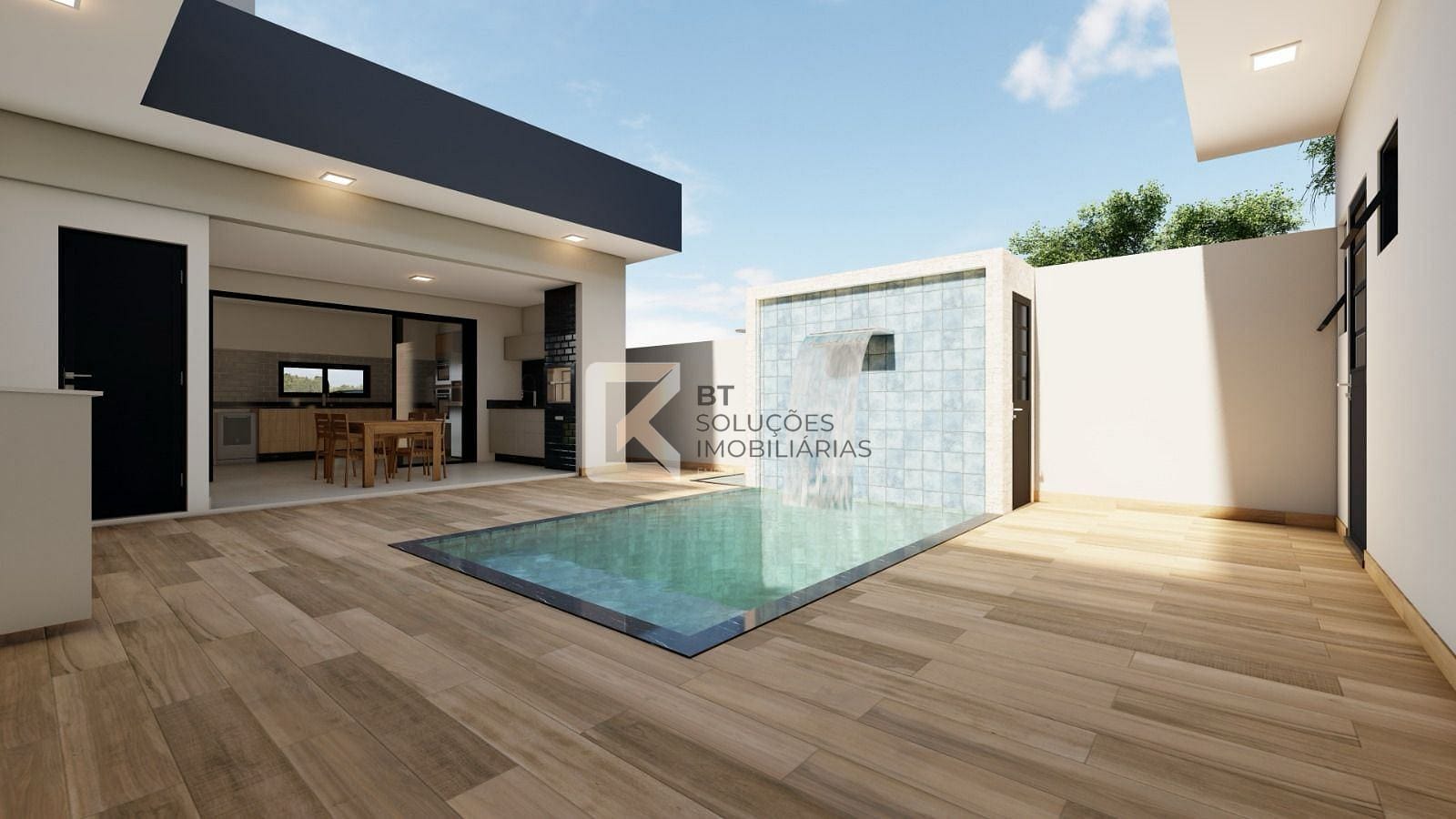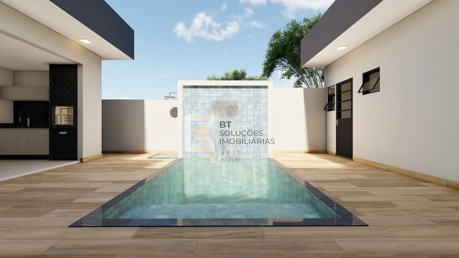 Área gourmet com piscina com cascata e churrasqueira.