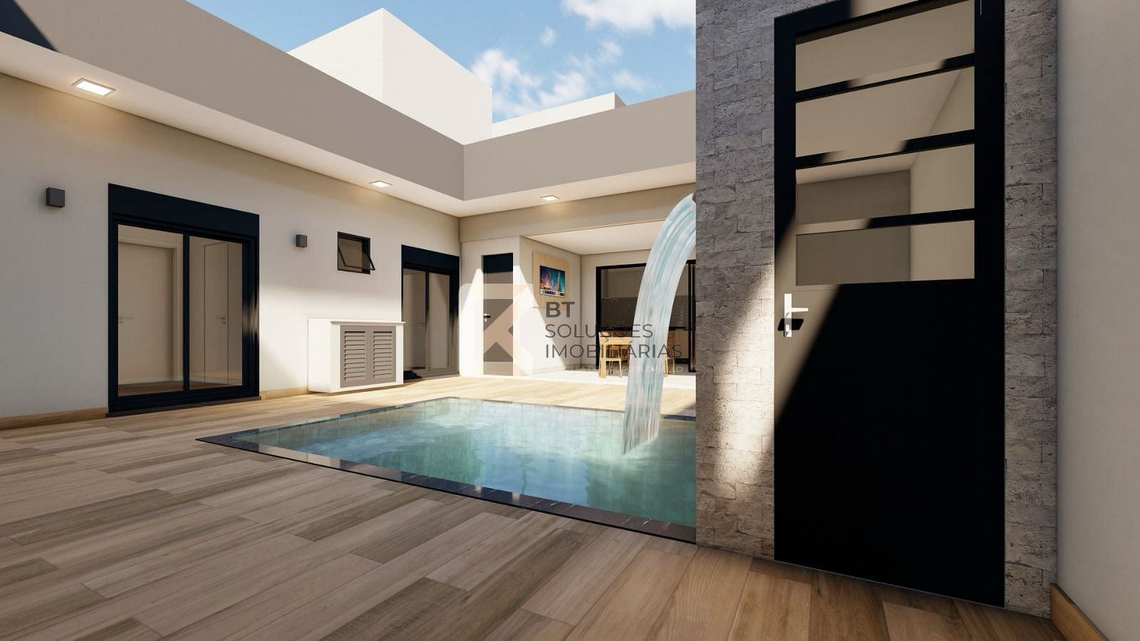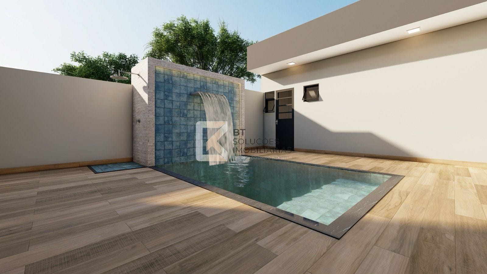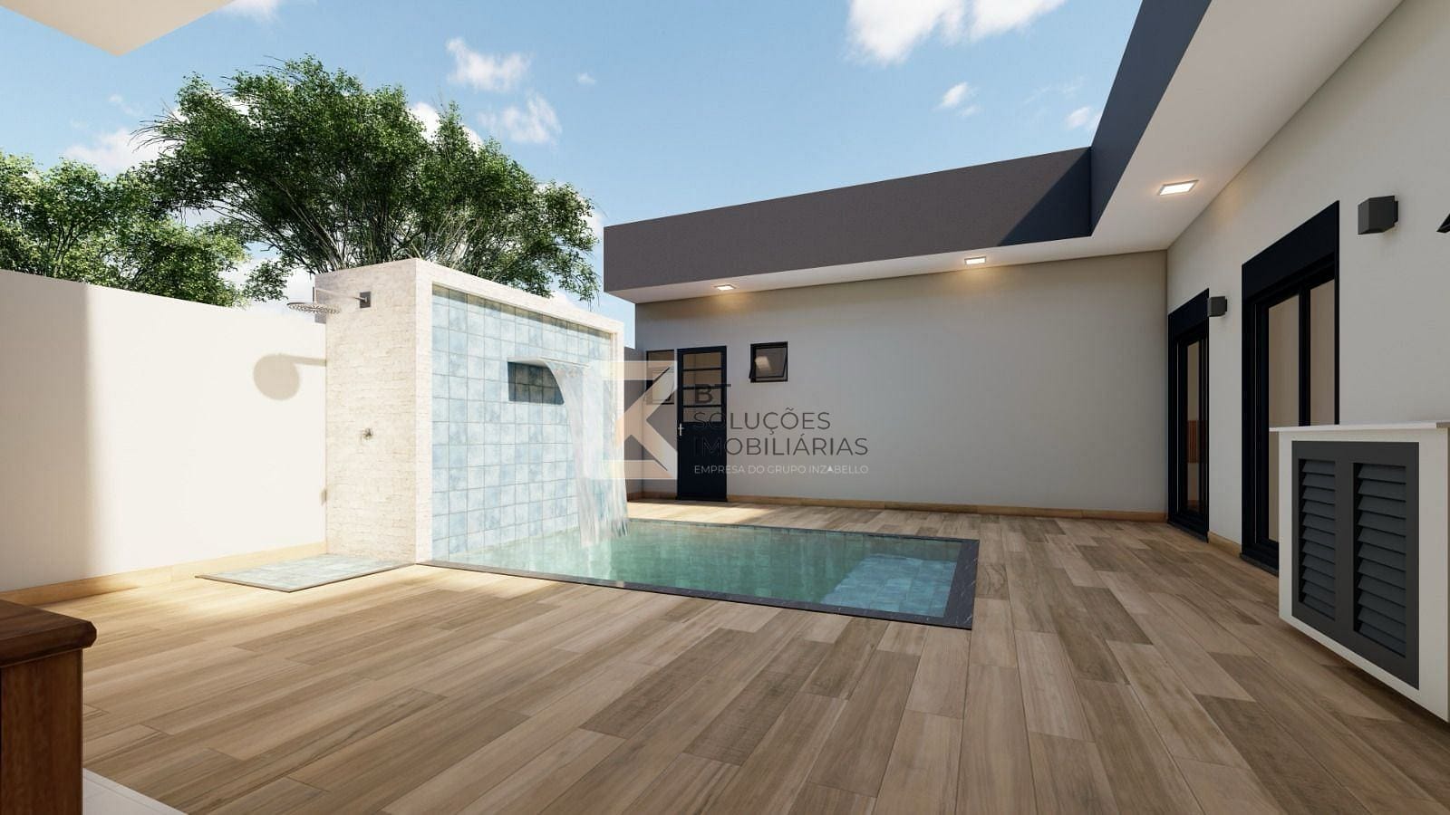 Área gourmet com piscina com cascata e churrasqueira.