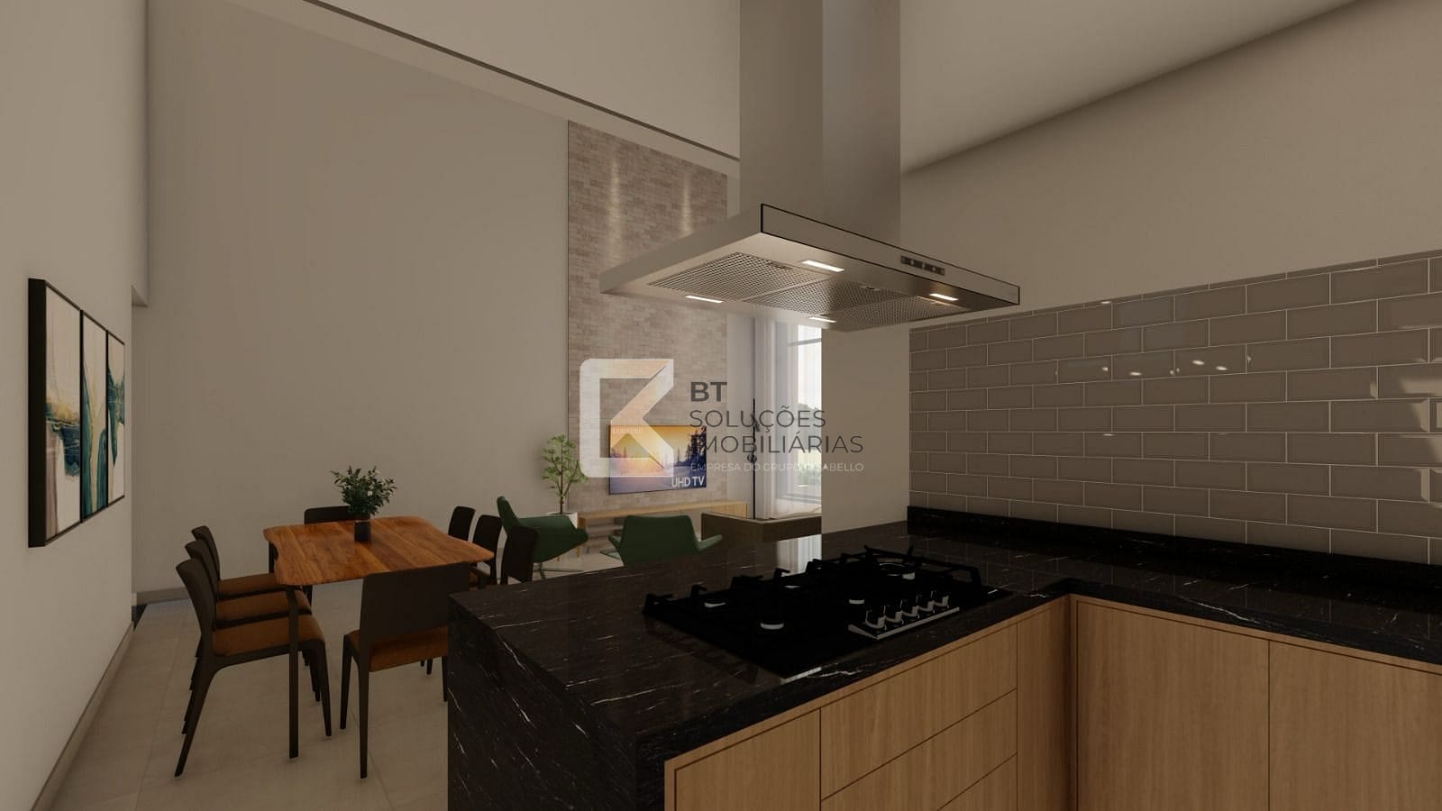 Cozinha americana com planejados, coifa e cooktop..