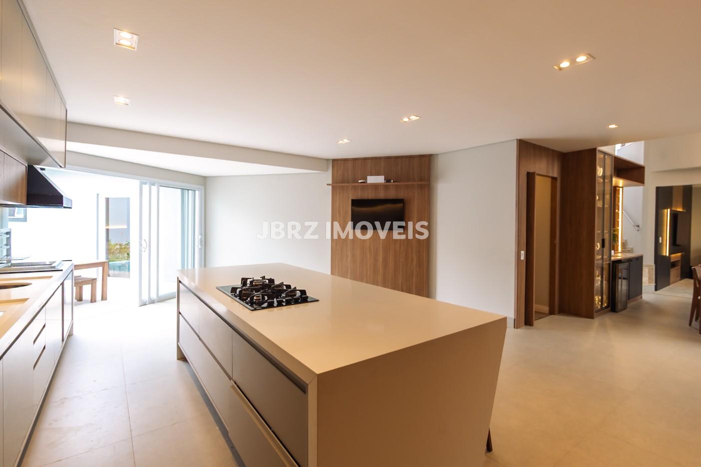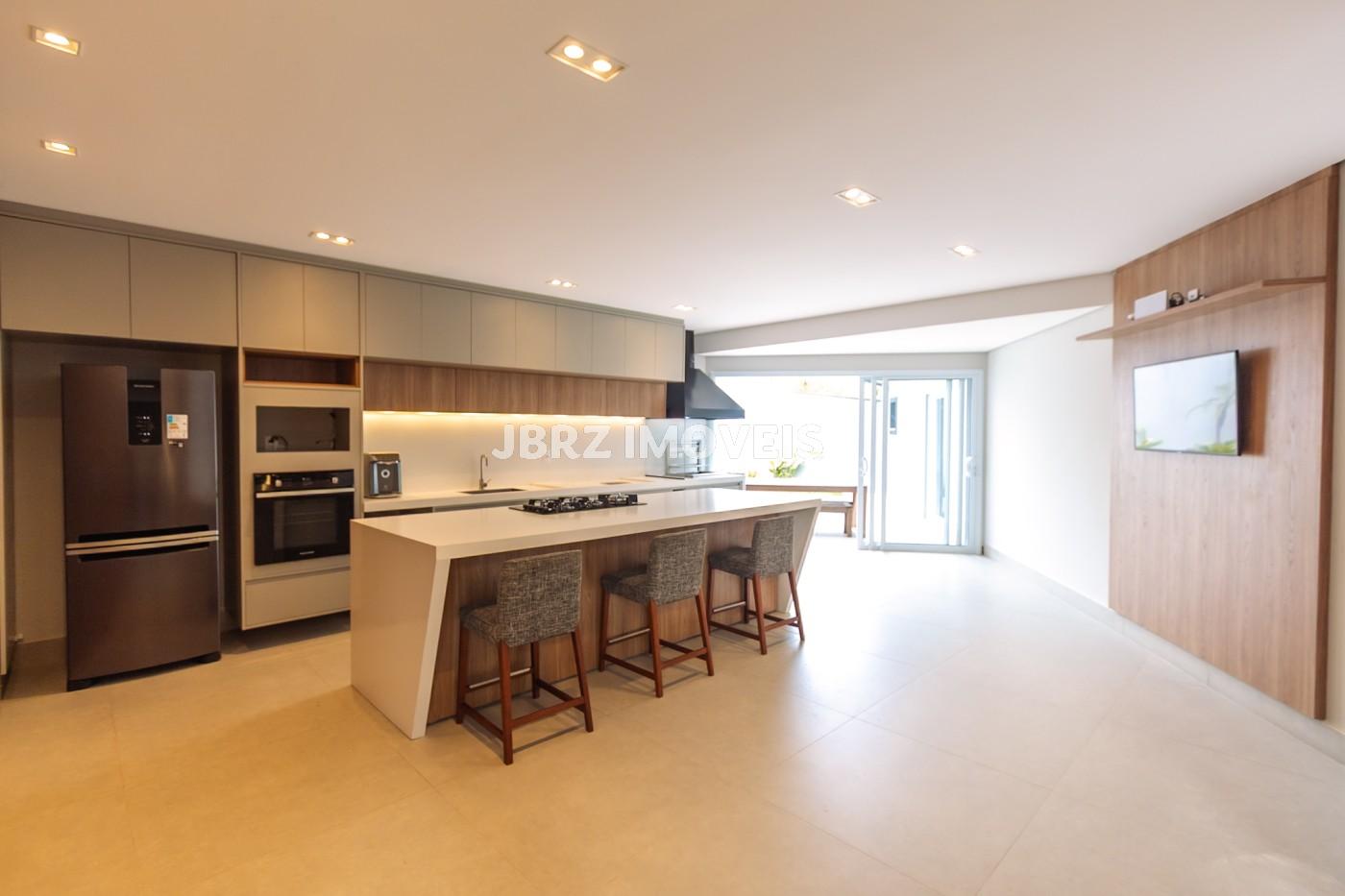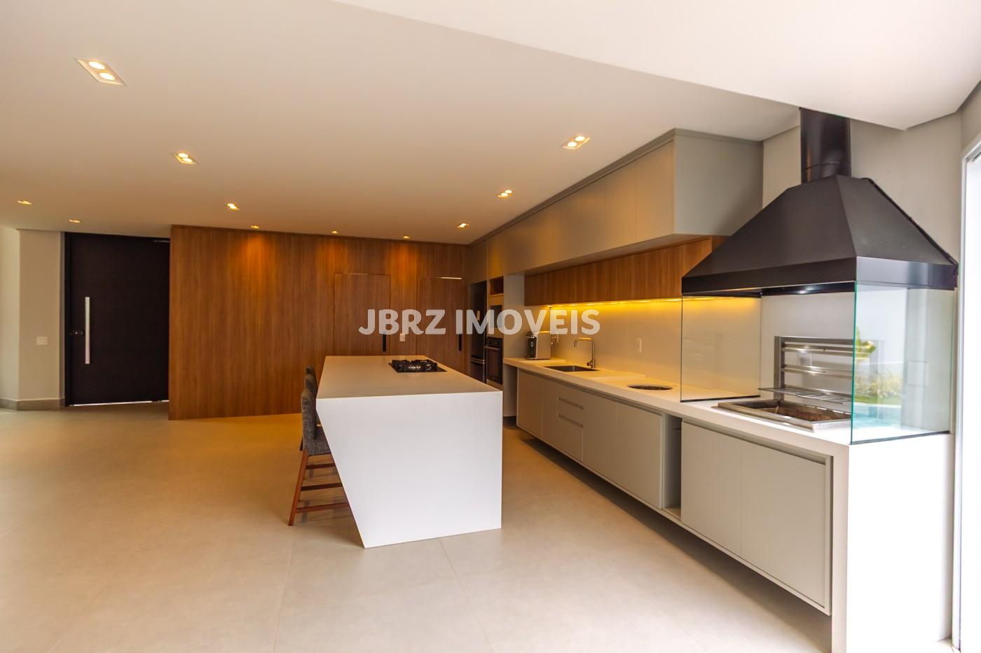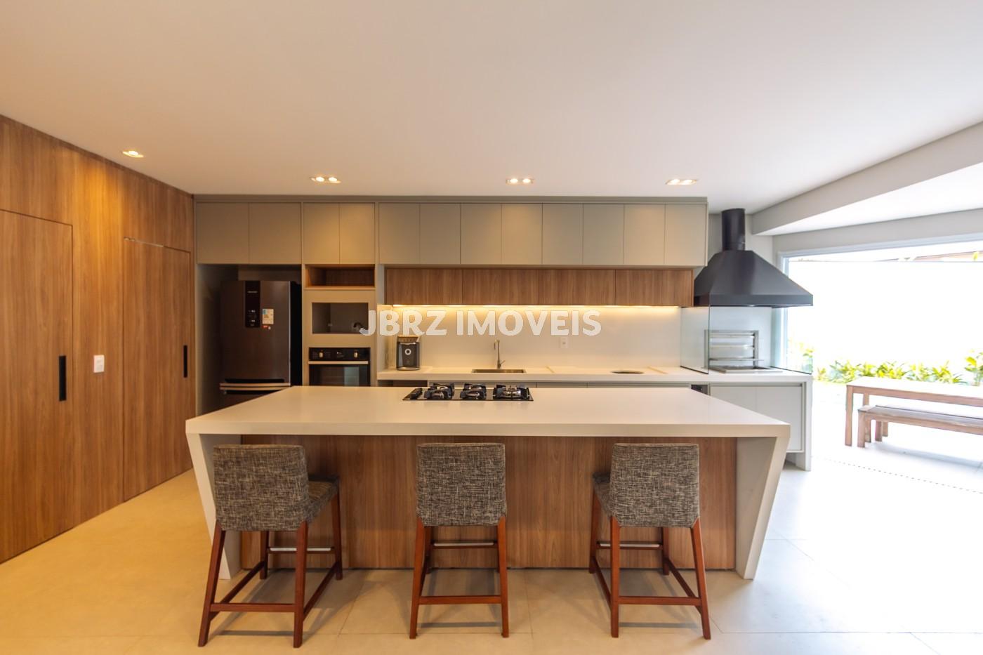 Cozinha e Área gourmet integrados com as salas, com churrasqueira e uma ampla ilha