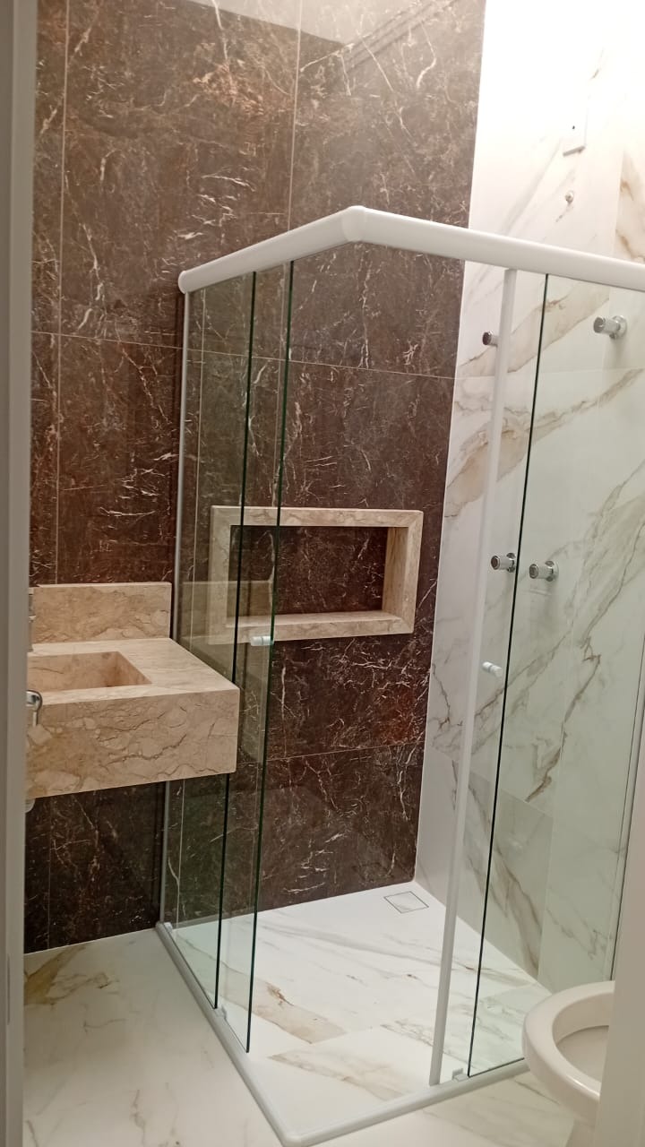 3 dormitórios sendo uma suíte com porta balcão para área externa, banheiro social com box em vidro temperado e acabamento em mármore travertino, claraboia e espaço closet.