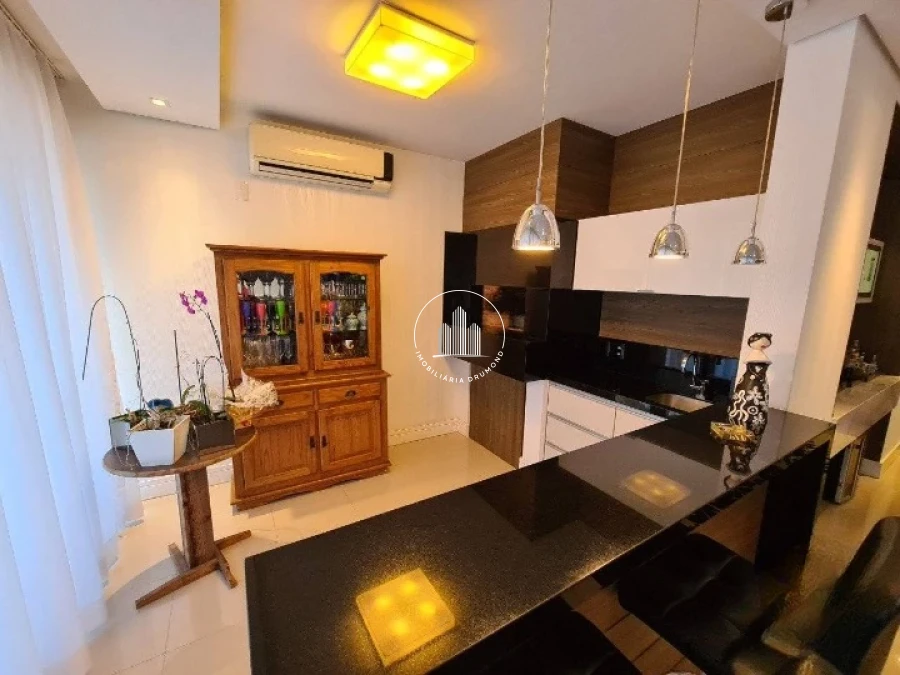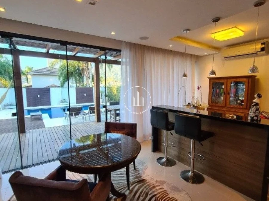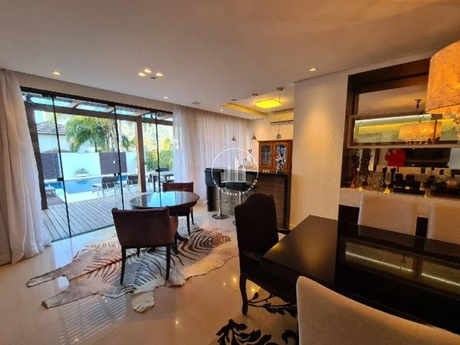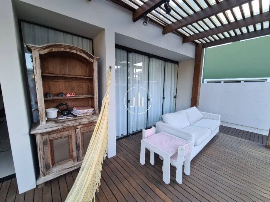 O ambiente também conta com uma lareira, que proporciona um toque acolhedor nos dias mais frios. A churrasqueira integrada ao deck externo torna o espaço perfeito para confraternizações ao ar livre. A área de lazer é complementada por uma piscina.