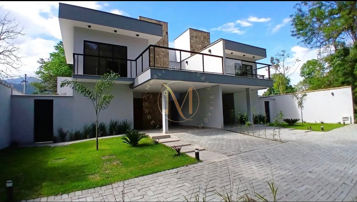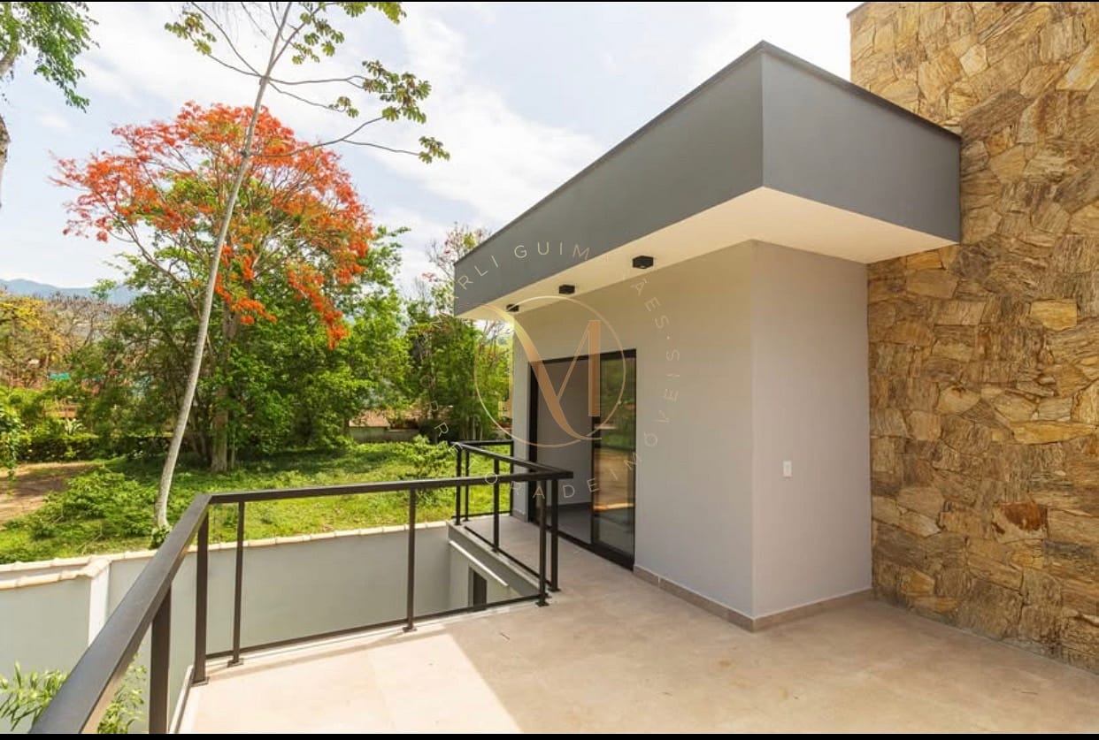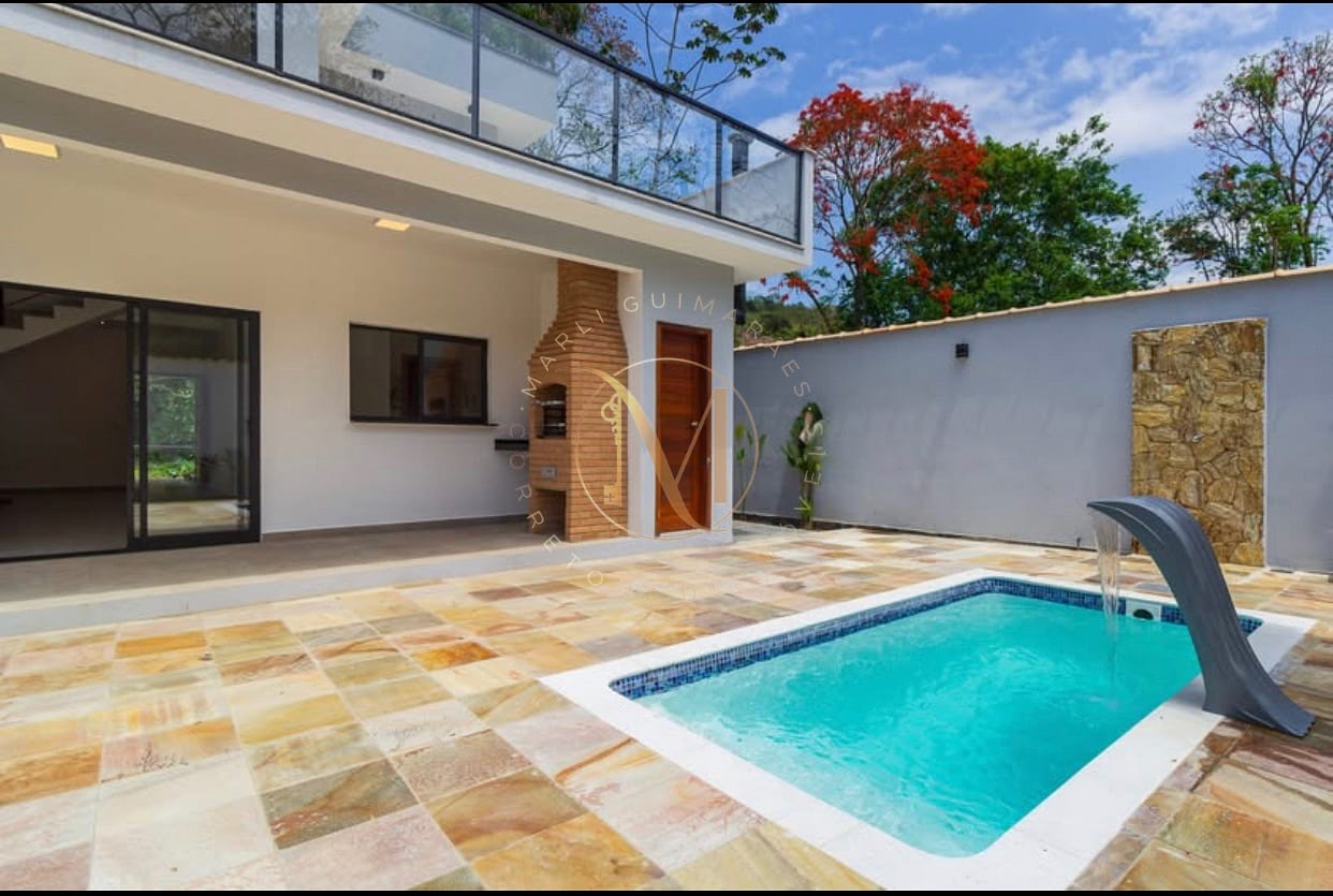 No pavimento superior, 2 amplas suítes, uma delas com closet, são abraçadas por amplos terraços, de onde seus moradores poderão apreciar uma bela vista da mata atlântica e o canto dos pássaros. Já no pavimento térreo, essa casa conta com um 1 dormitório e 1 banheiro completo, embora cômodos individuais, eles foram alocados de forma estratégica, possibilitando a conversão numa suite, uma ampla sala e uma cozinha americana com bancadas de granito e acesso à area de serviços, concluindo assim a àrea interna do imóvel. Para aqueles que gostam de reuniões sociais, esse imóvel oferece uma área gourmet com churrasqueira, além de uma bela piscina. Na parte frontal do imóvel, um belo jardim convida aos visitantes para ingressarem neste charmoso imóvel.