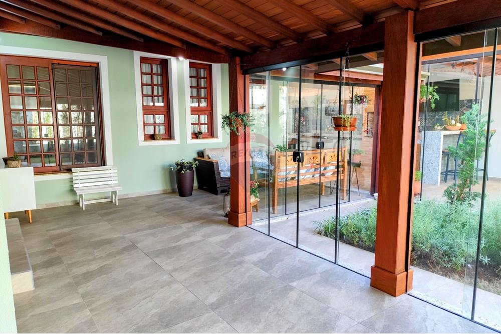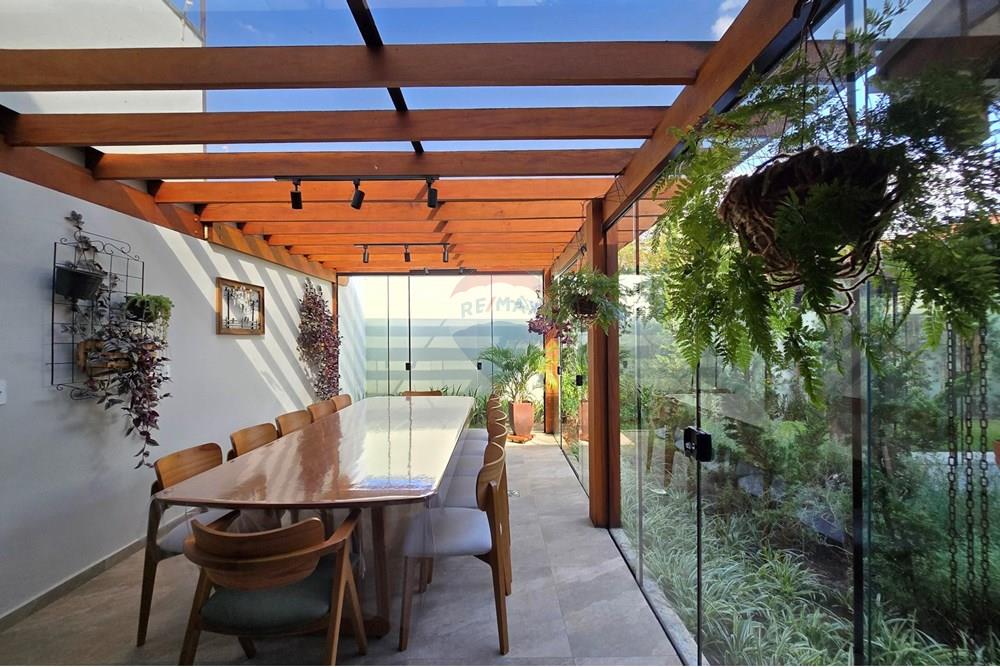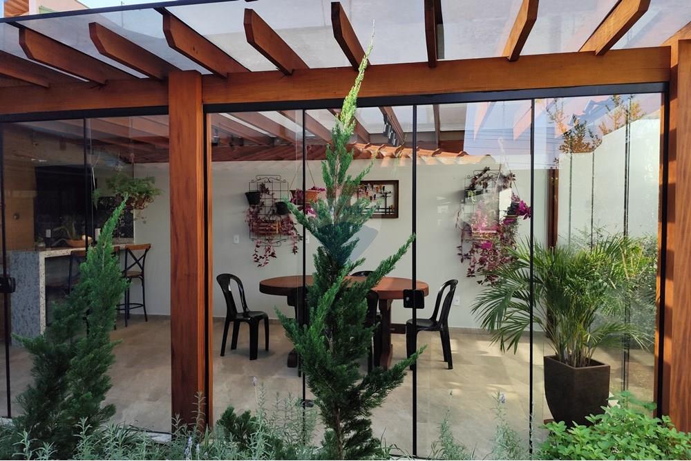 Varanda gourmet coberta com aconchegante pergolado envidraçado, perfeita para reunir família e amigos.