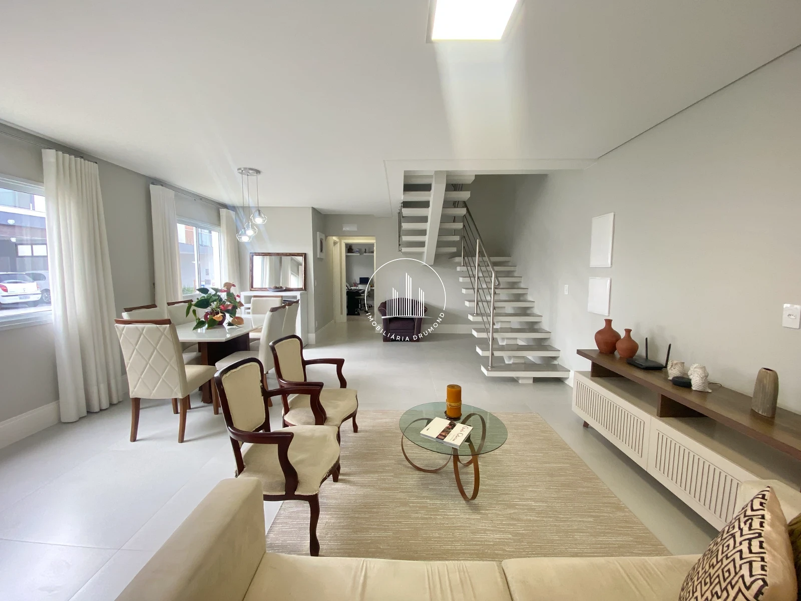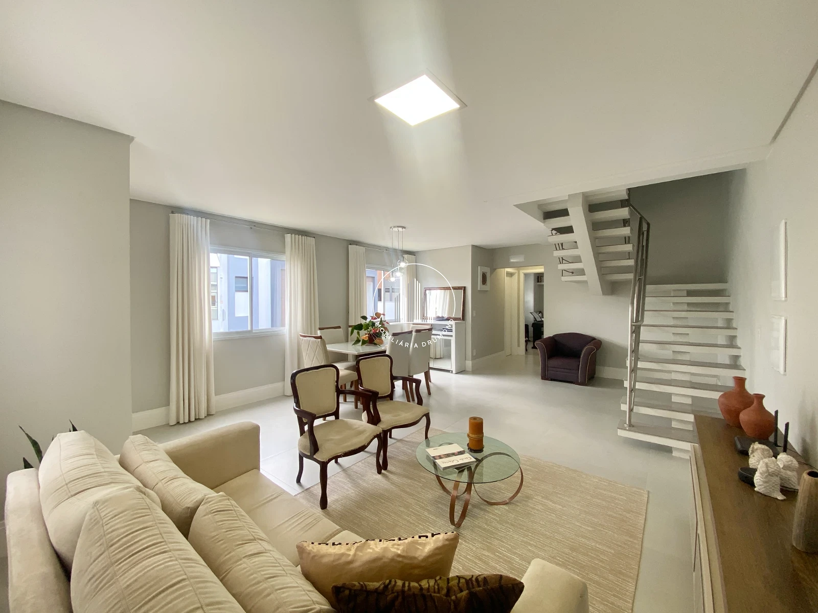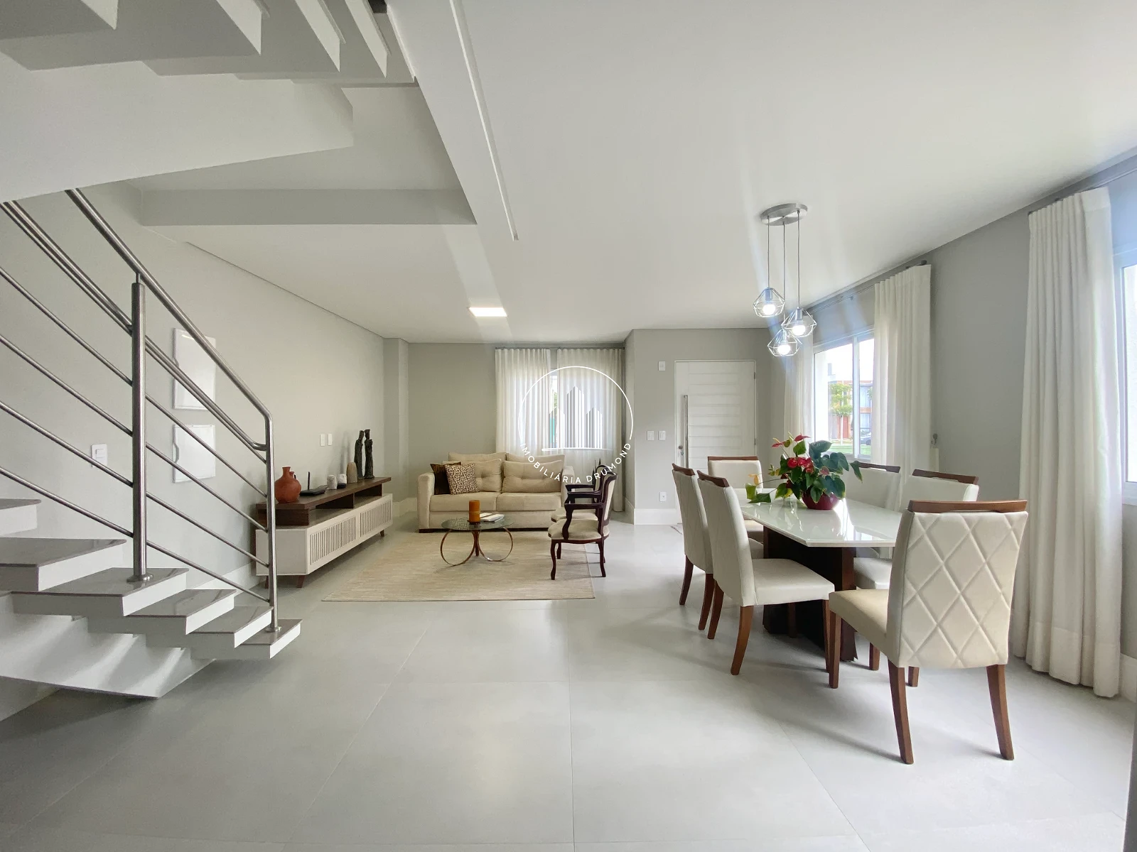 Sala de jantar e estar ampla com cortinas;
