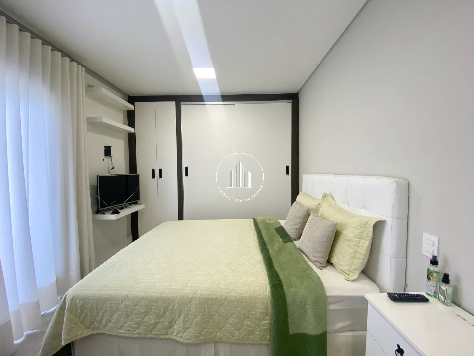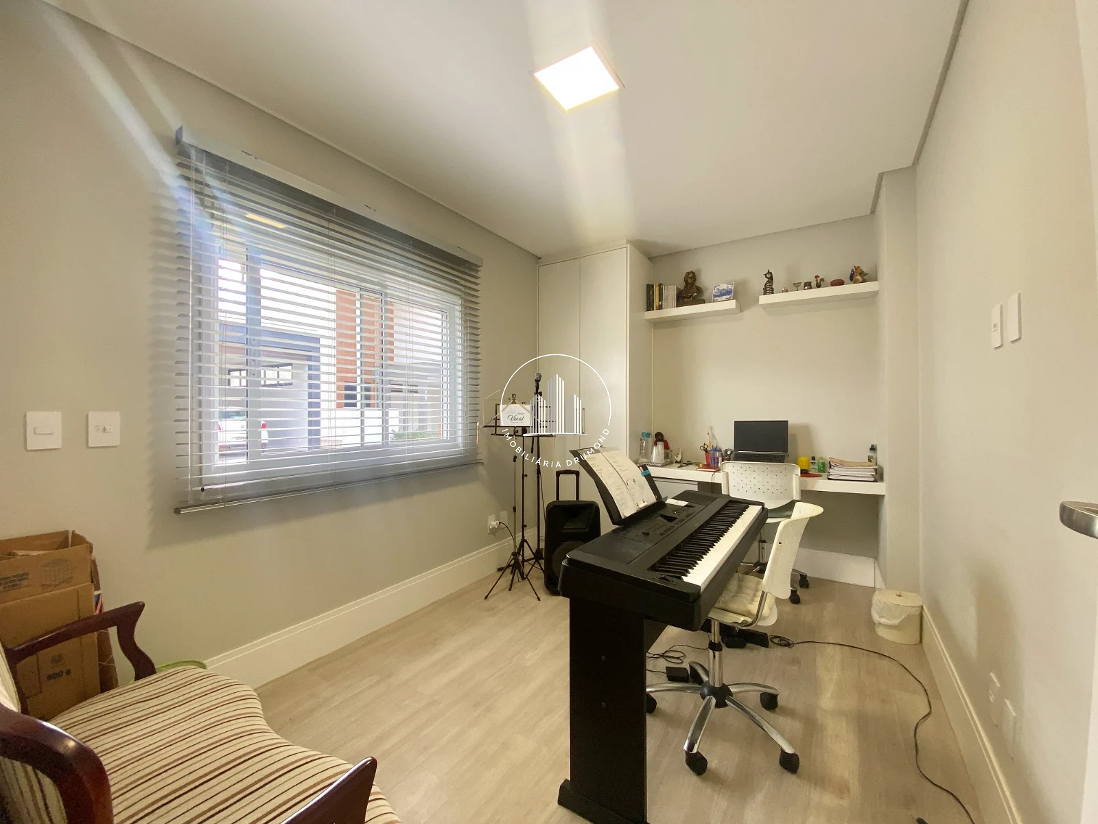 01 sala de televisão (pode servir como quarto) com planejados, persiana de fechamento automática e persiana manual.