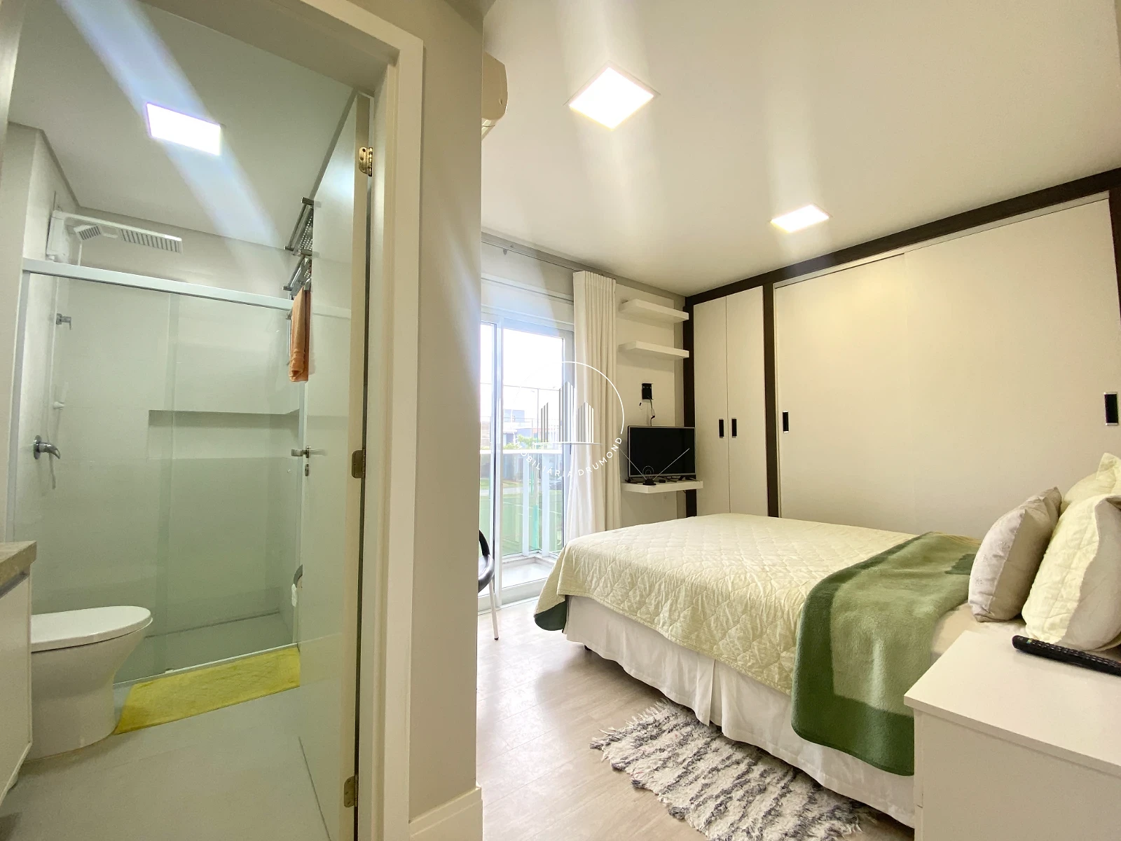 01 dormitório suíte com móveis planejados, persiana de fechamento automática (porta janela);