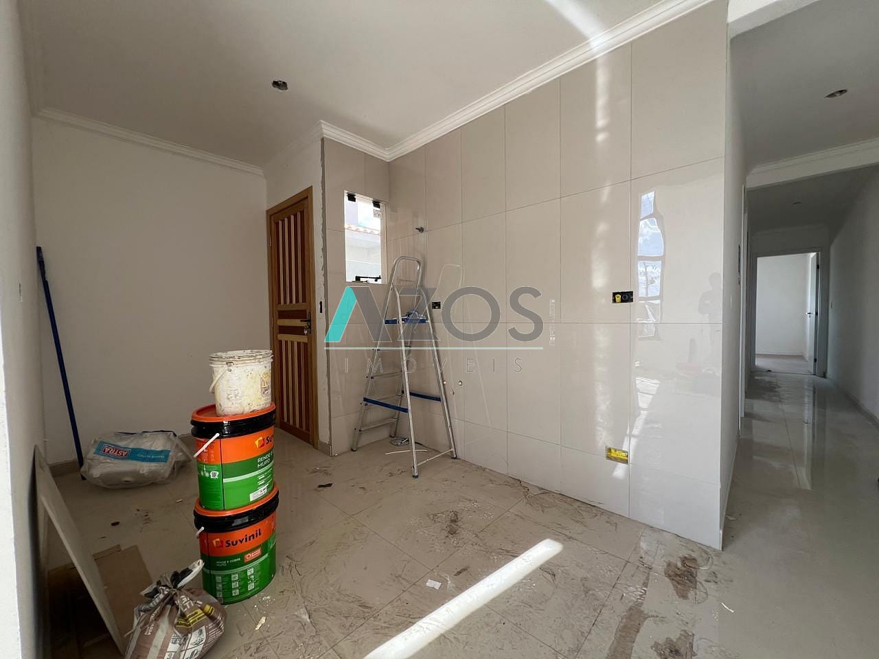 Pintura projetada, aquecimento a gás, banheiro e cozinha com piso Porcelanato.