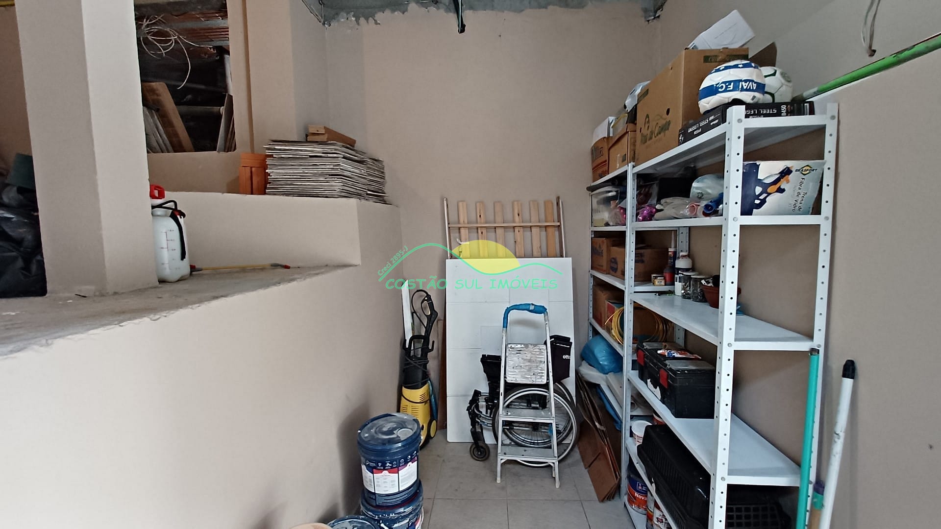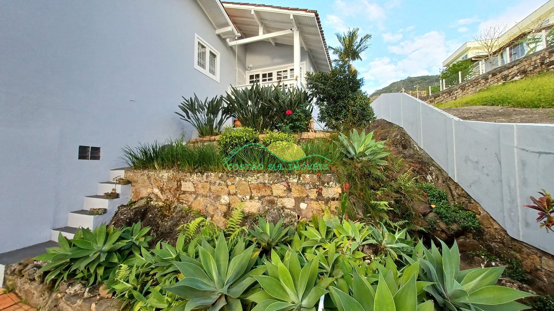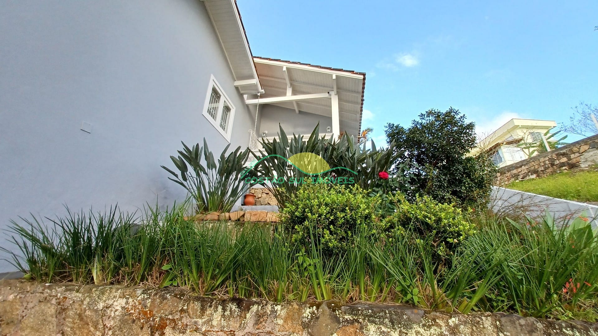 Amplo quintal ajardinado com piscina, cachoeira ornamental (abastecida pela água vinda do morro na época de chuvas), garagem coberta para dois veículos com portão eletrônico e um grande depósito.