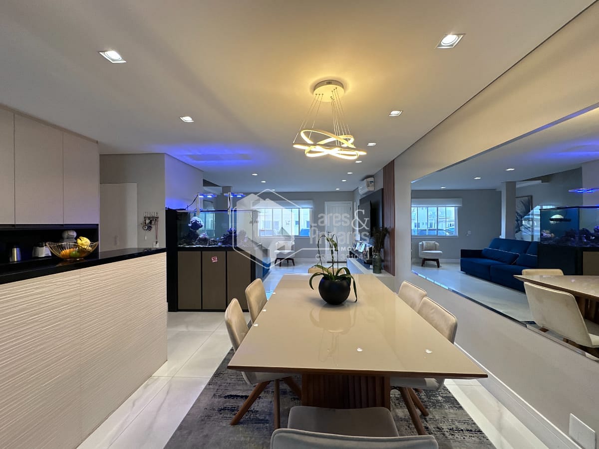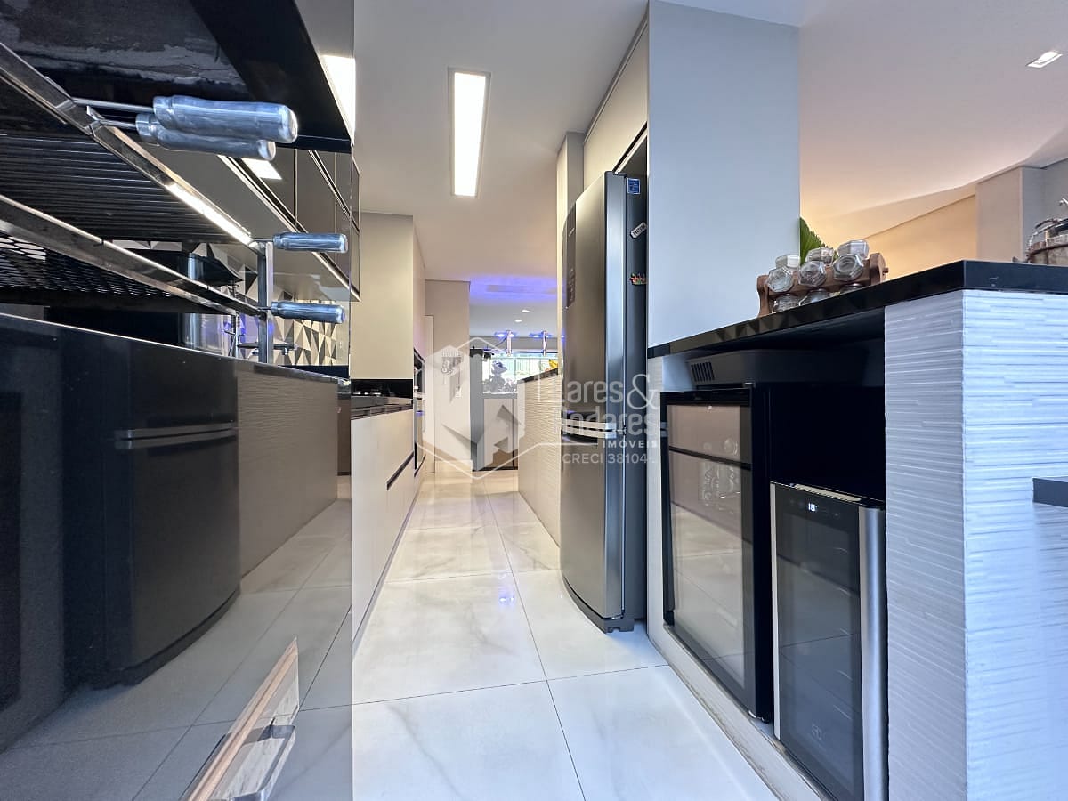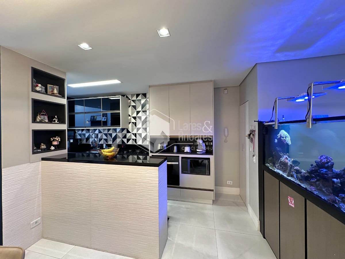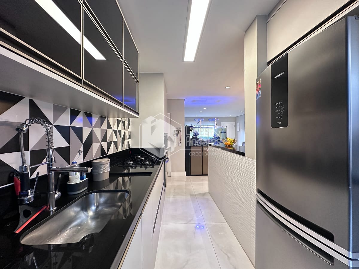 Cozinha integrada à sala de estar e jantar, promovendo um ambiente amplo, iluminado e perfeito para receber amigos e familiares.