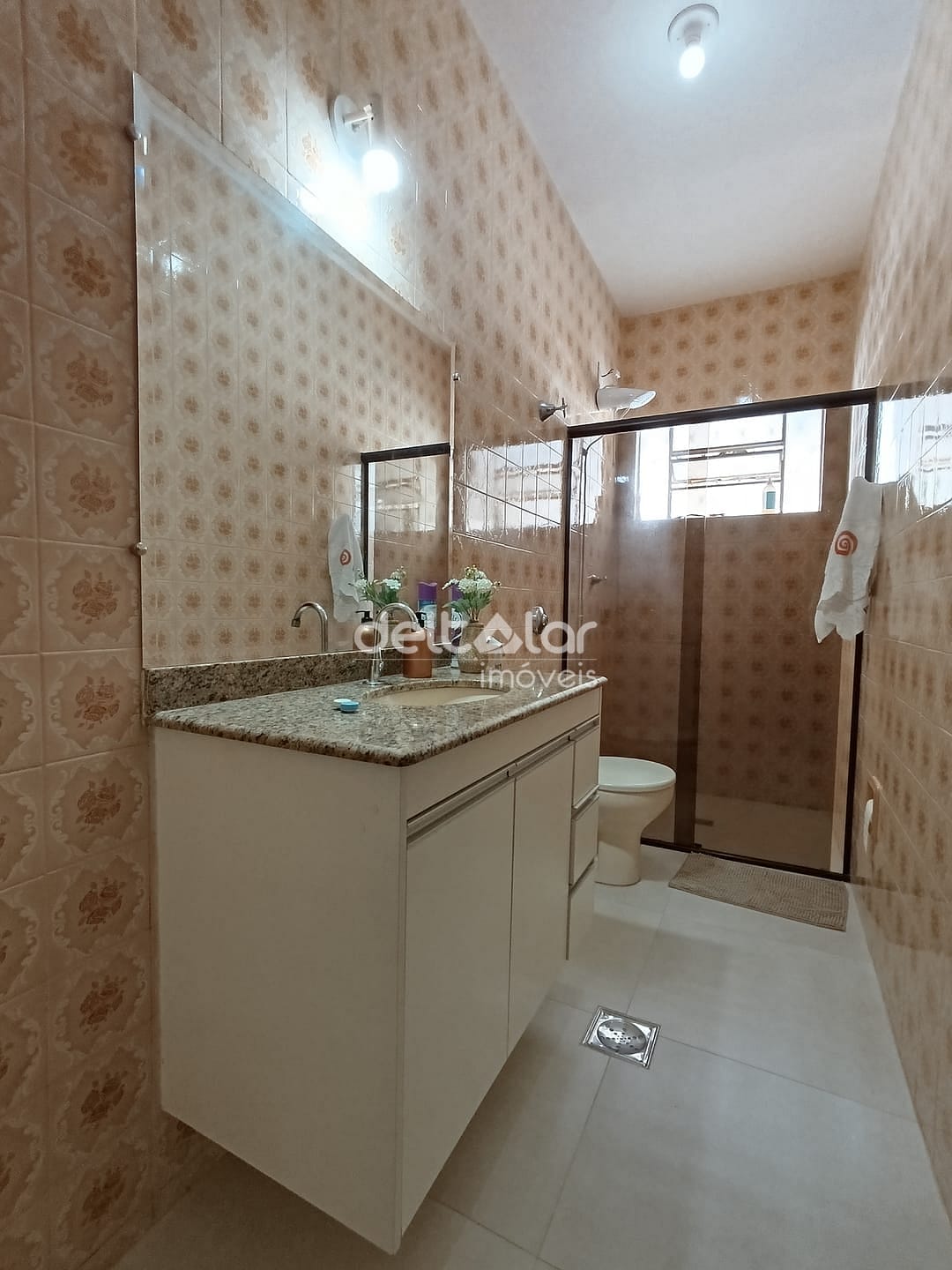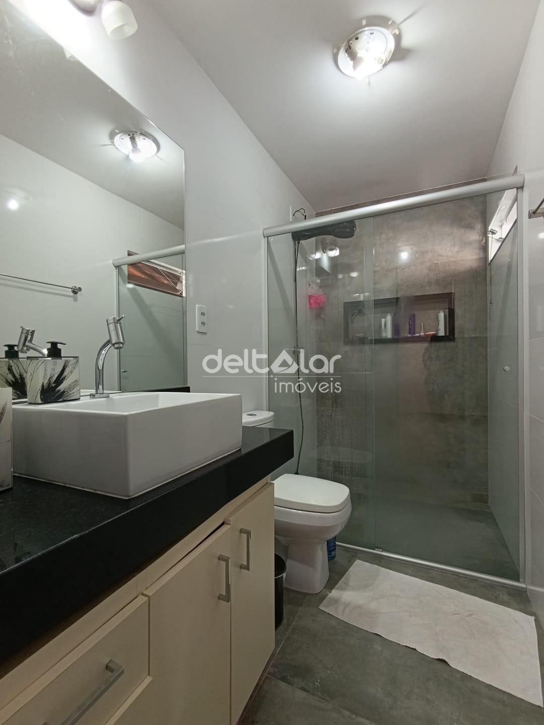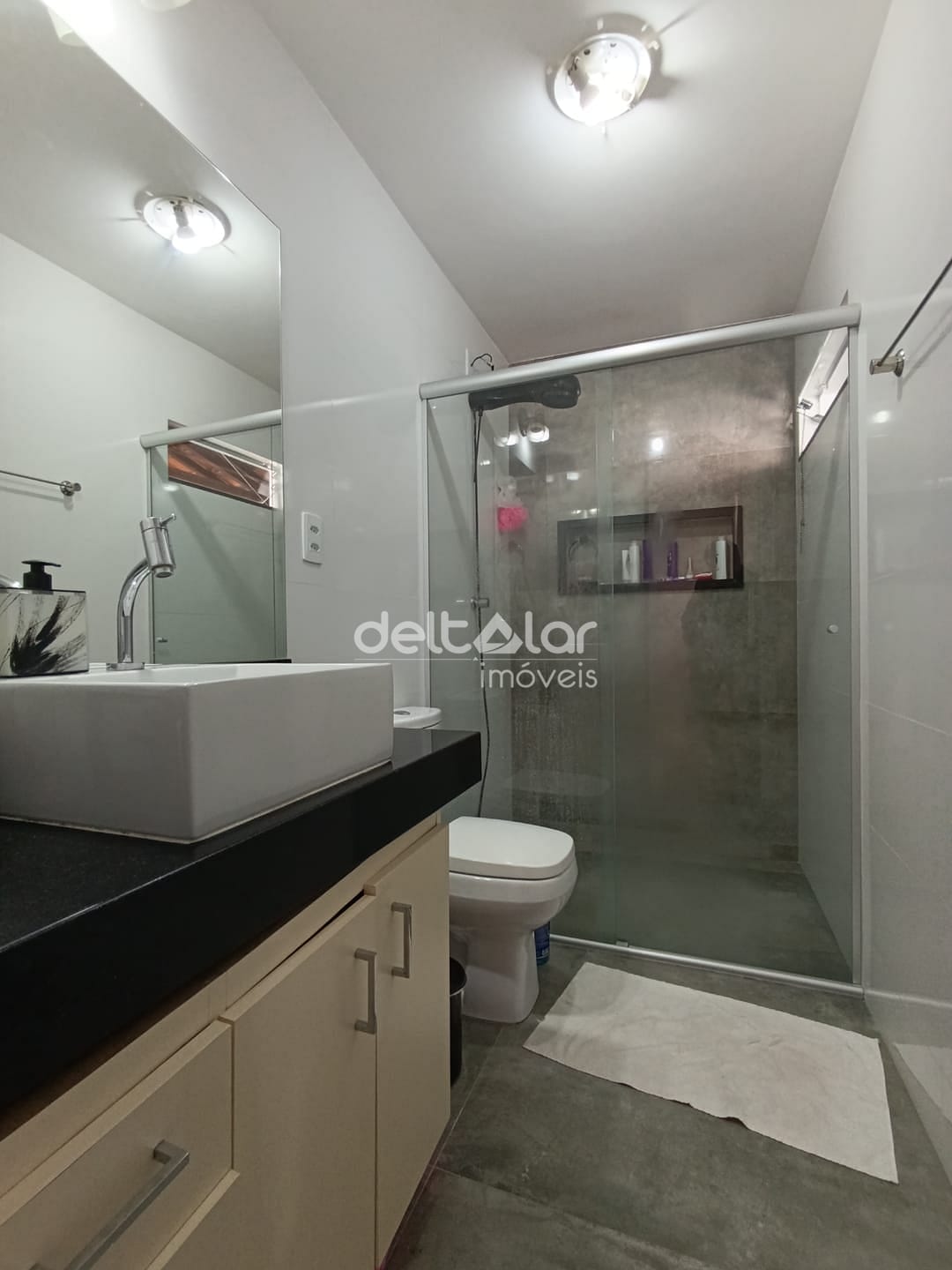 01 Banheiro social com bancada em granito, espelho, armários planejados e box em blindex;
