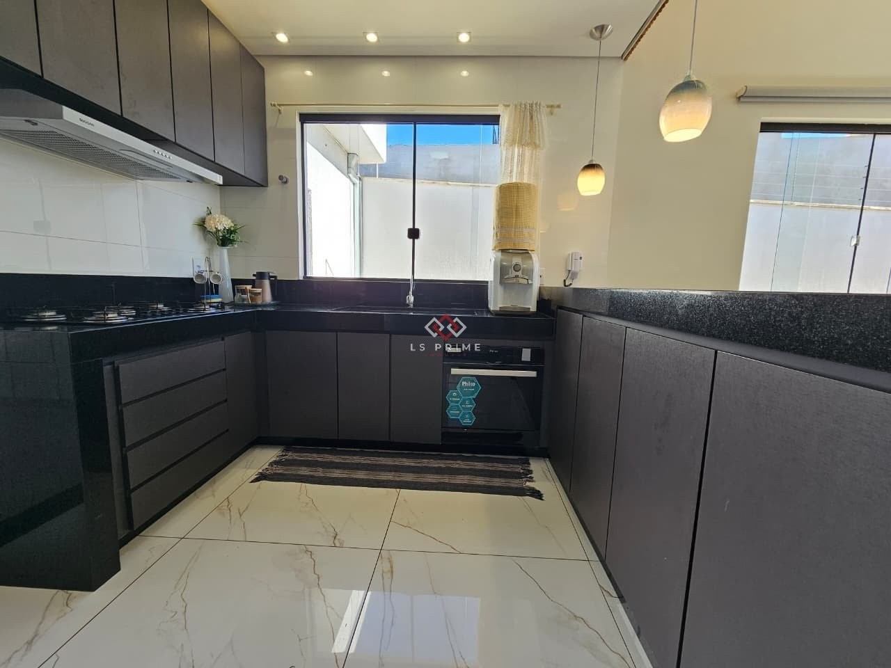 Área gourmet completa, com churrasqueira, bancada em granito e armários