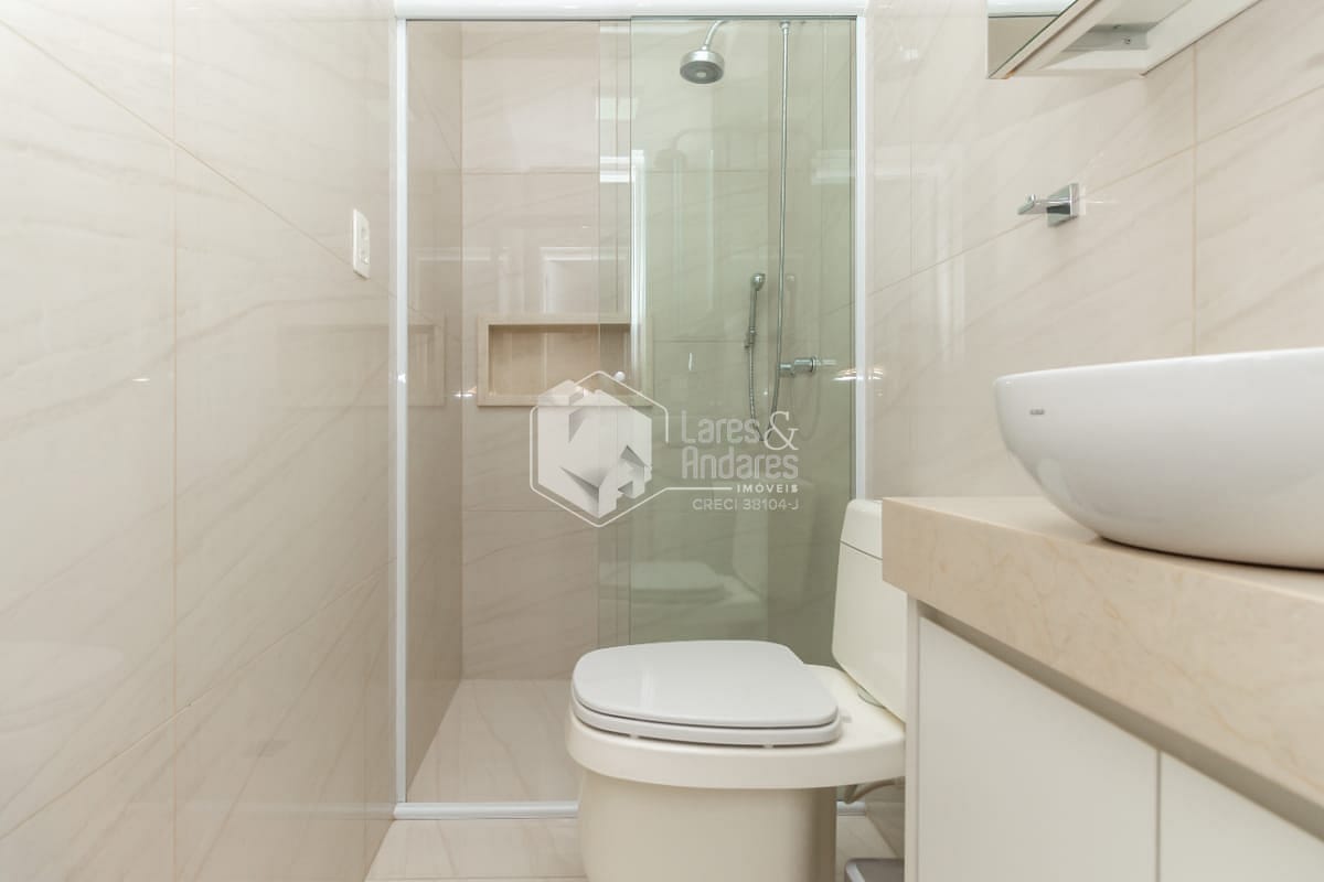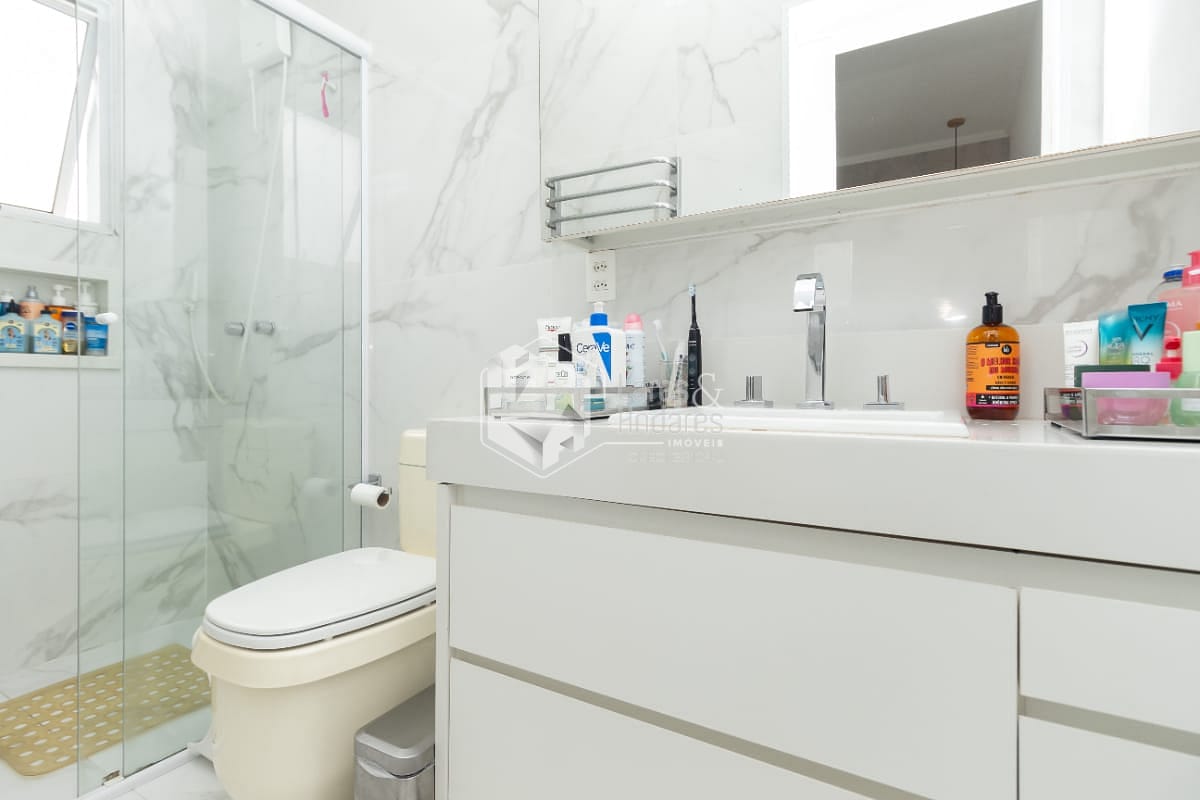 - 3 banheiros, incluindo a suíte, todos com box de vidro e gabinetes modernos.