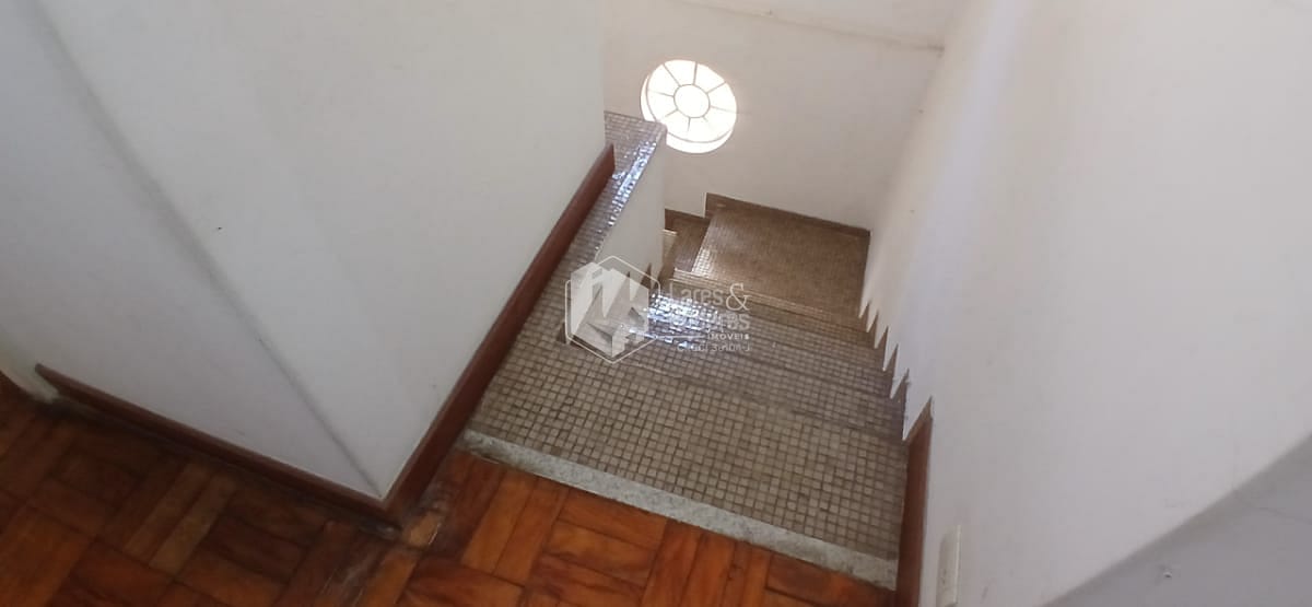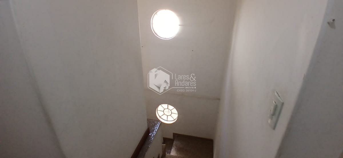 A escadaria possui piso tipo pastilha, o qual traz um estilo moderno à circulação, e as duas janelas redondas iluminam bem o ambiente.