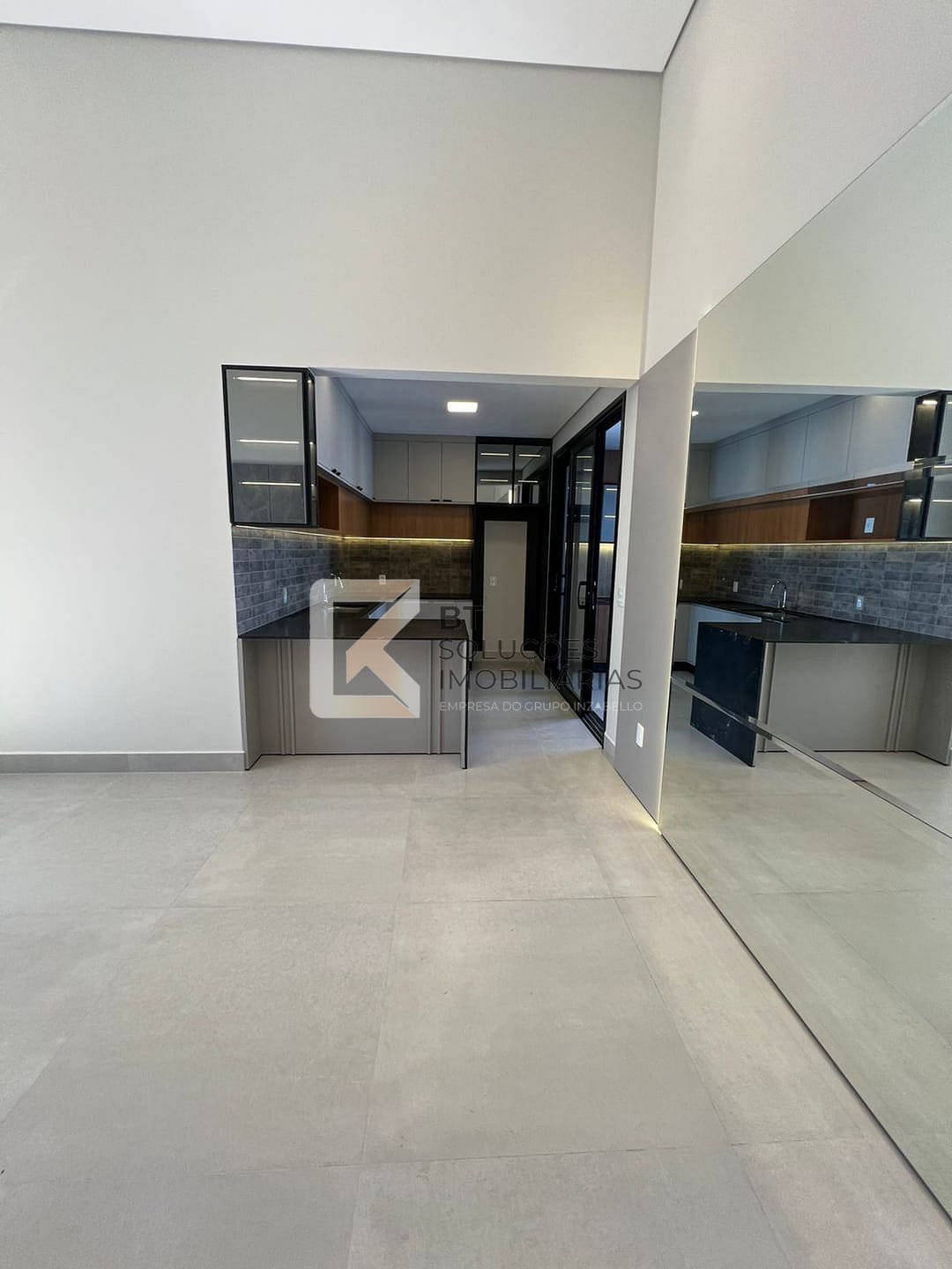 - Sala de estar e jantar integrados com espelho e painel com portas embutida