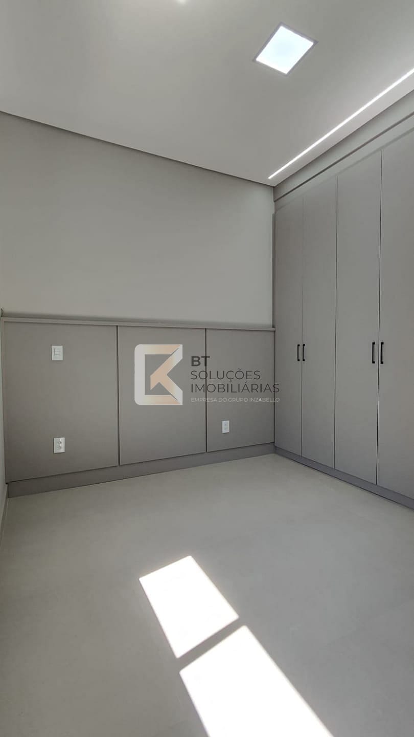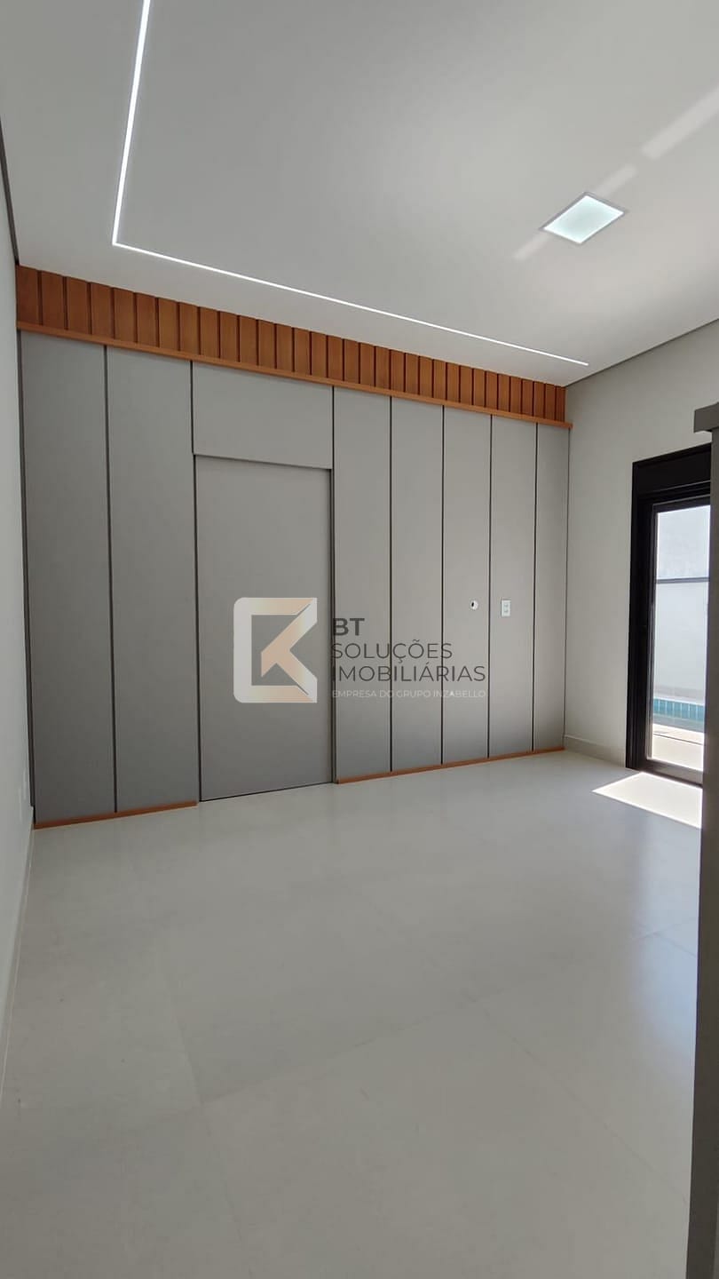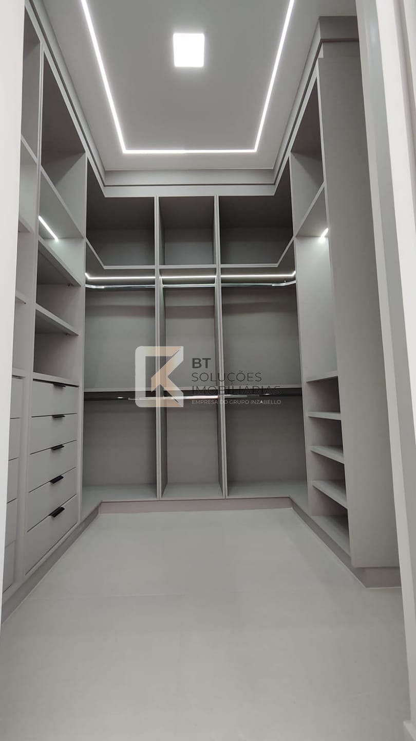 - Suíte master com armários, closet com acesso ao banheiro, cabeceira de cama, criados mudos e painel para tv