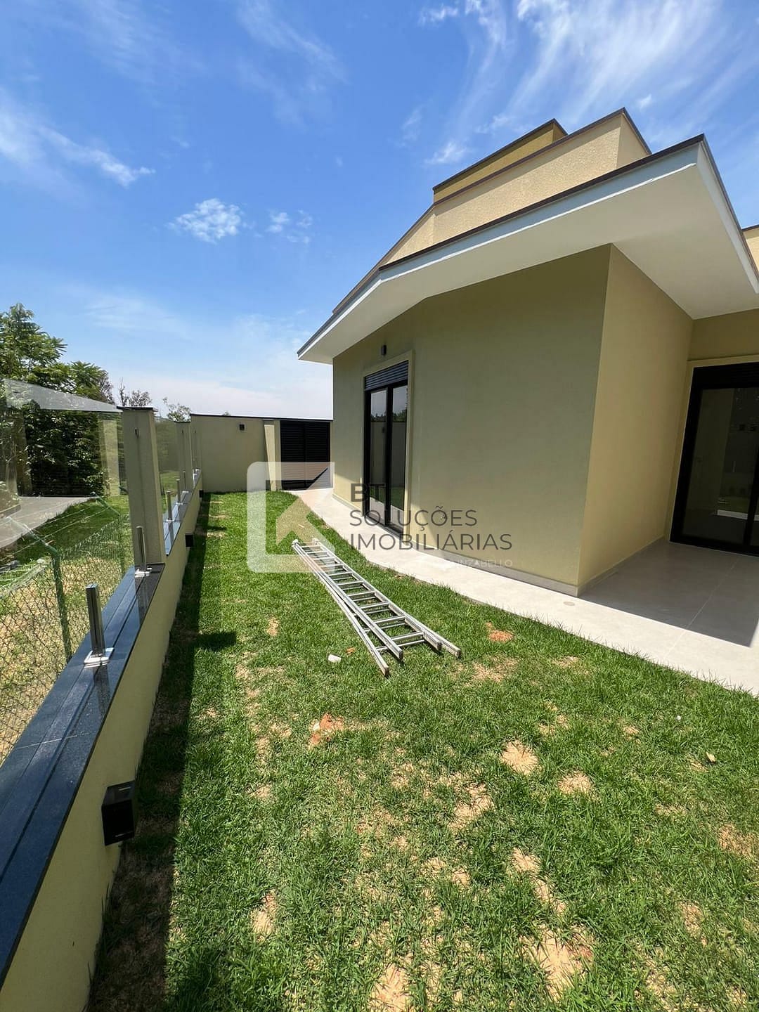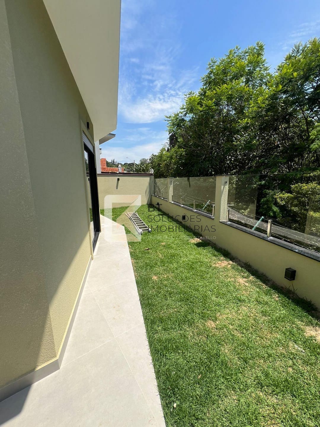 - Área externa com grama e vista para mata