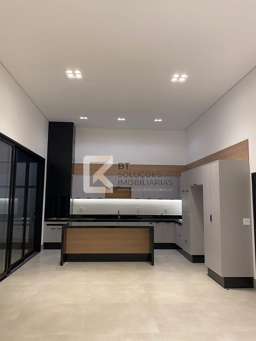 Sala e cozinha com pé-direito alto, proporcionando maior amplitude e iluminação natural