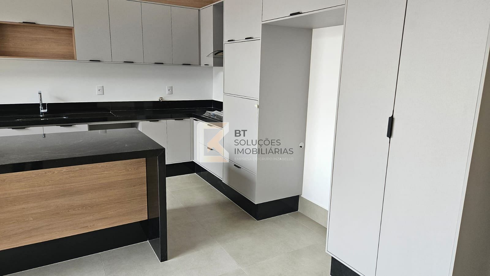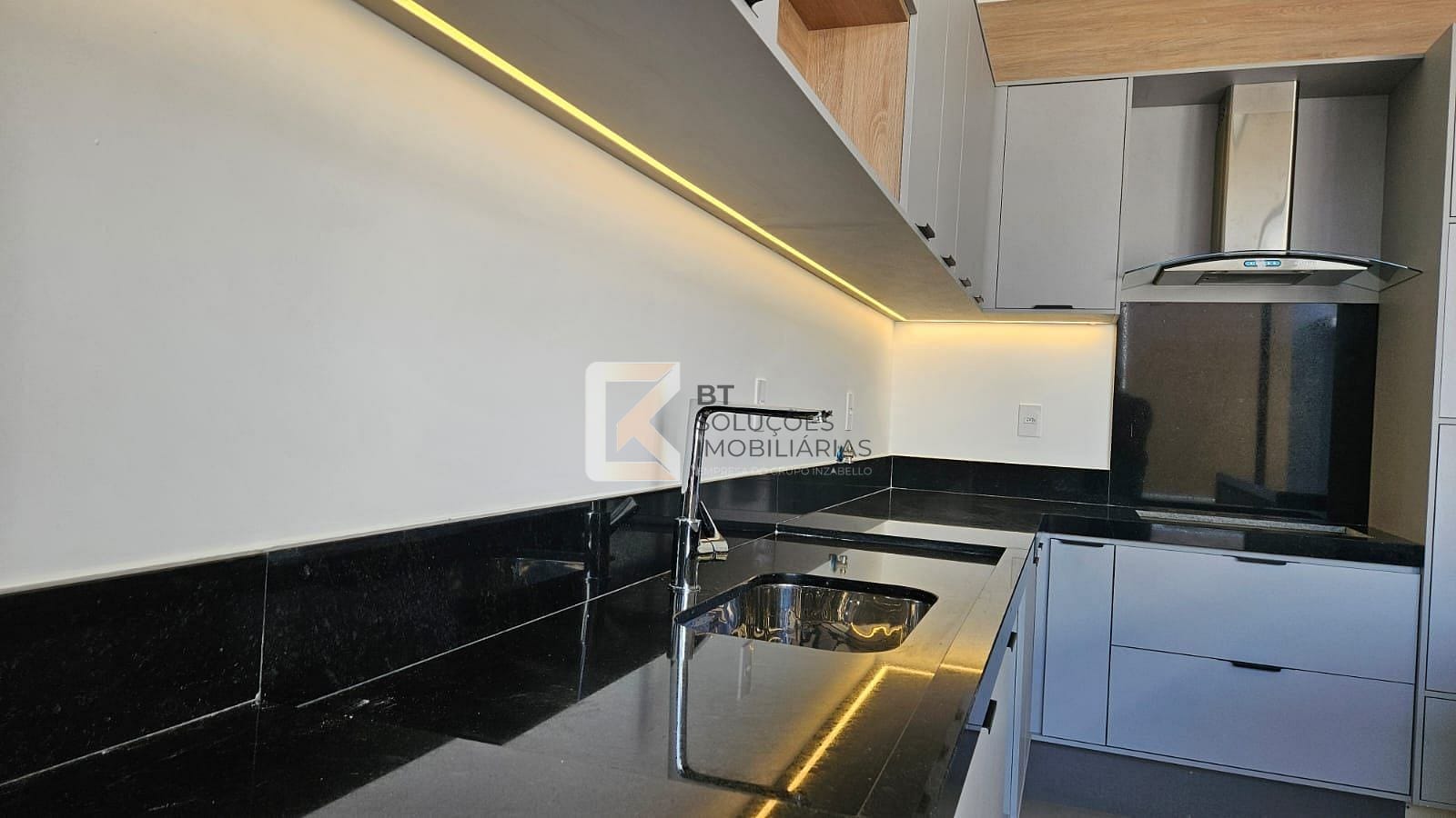 Cozinha com ilha, gabinetes com iluminação em LED, cooktop e coifa