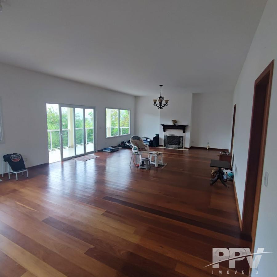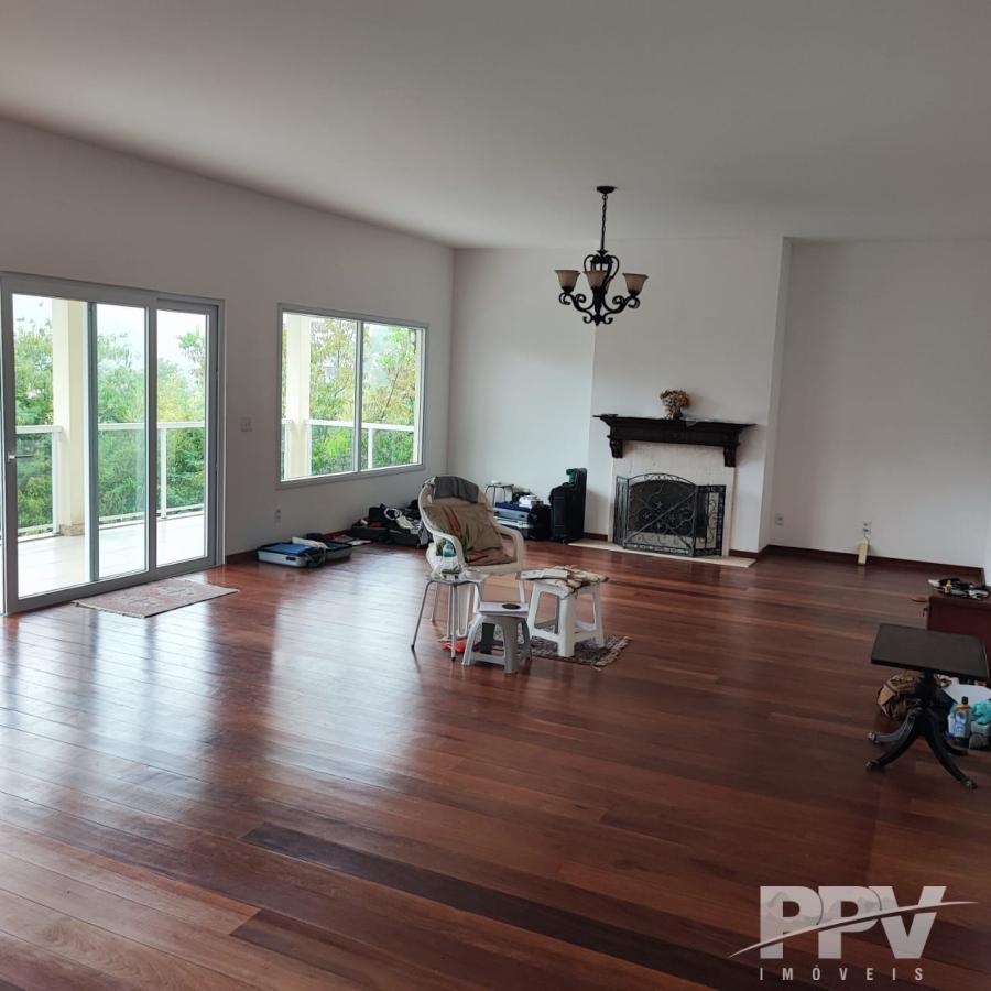 Sala toda em tábua corrida, muito clara, com lareira e linda vista da paisagem.