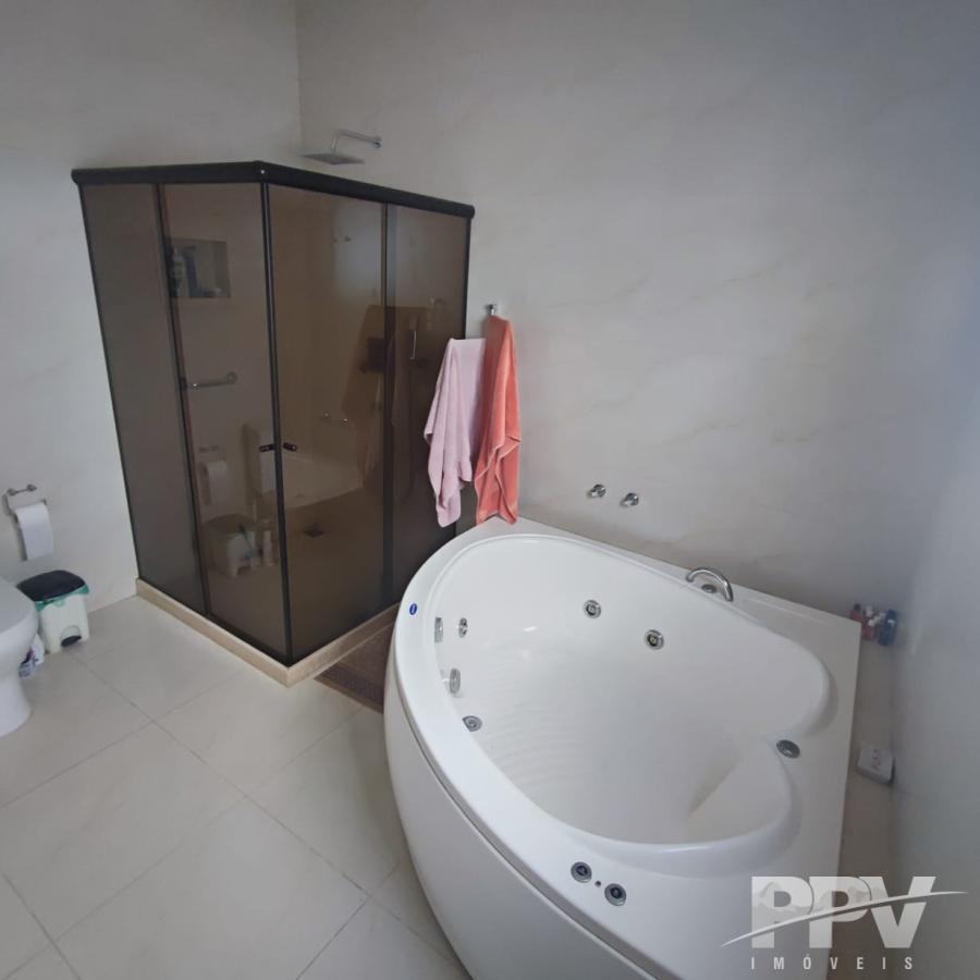 Uma suíte master no andar térreo, com closet e hidromassagem.