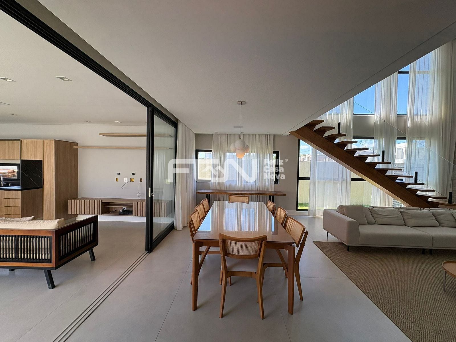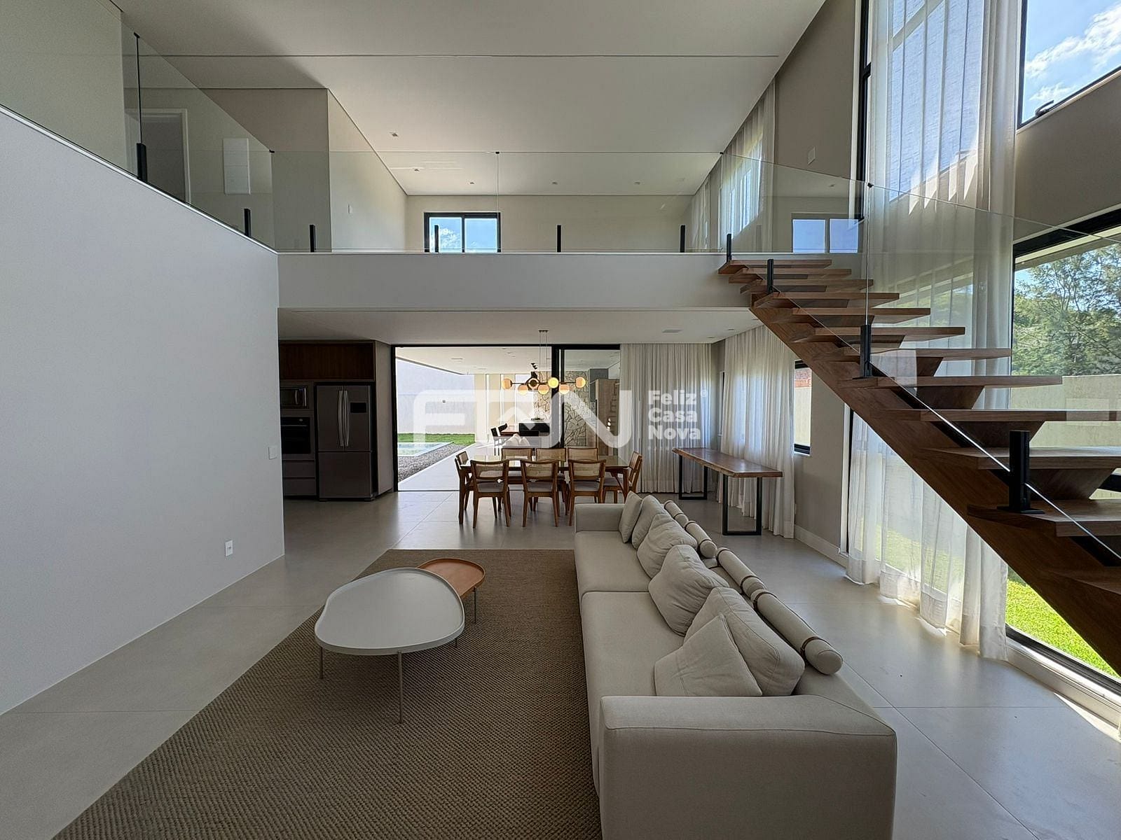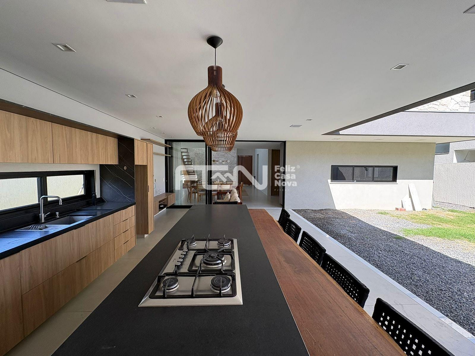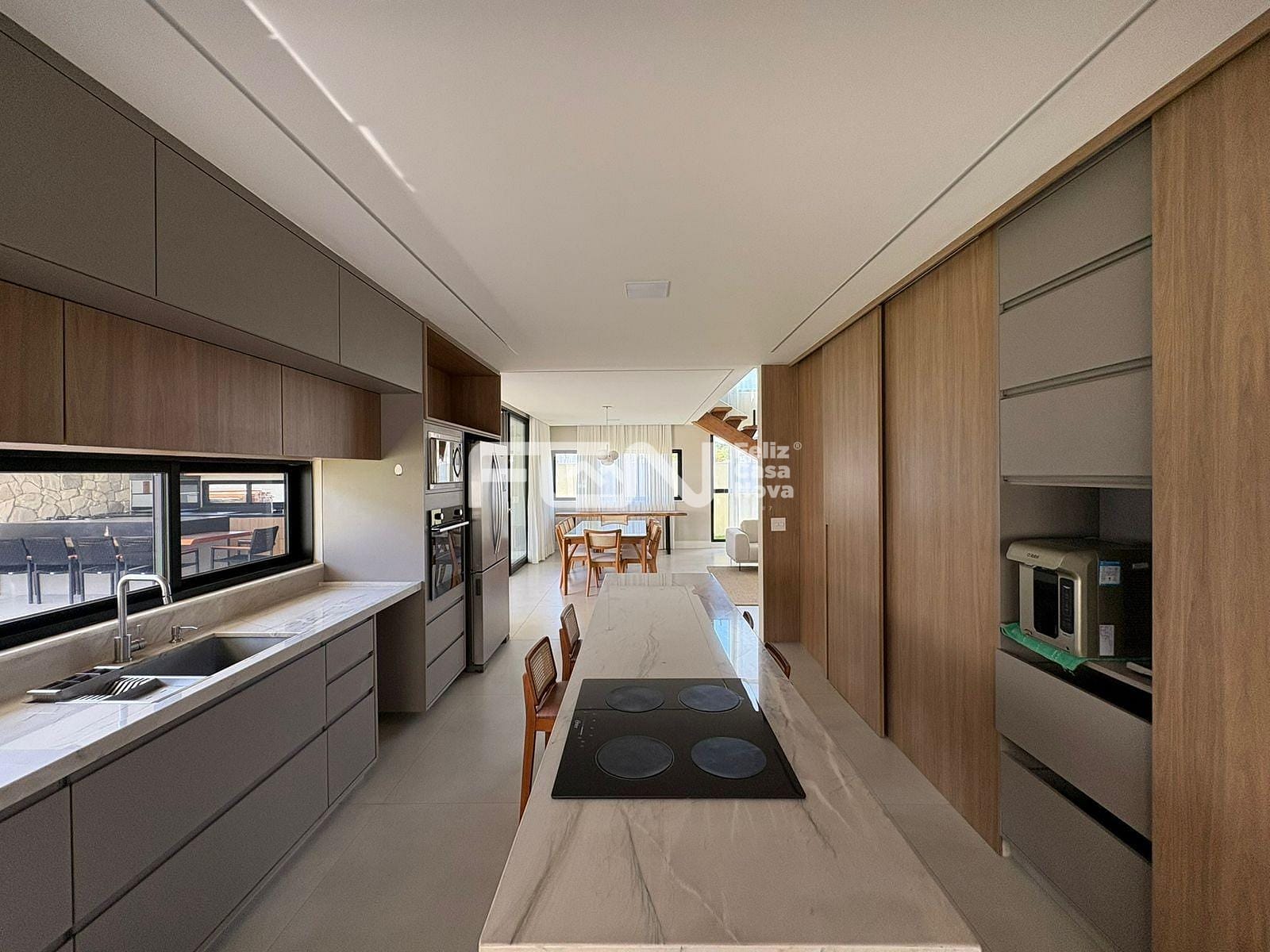 A casa possui sala com pé-direito duplo, além de cozinha completa, equipada com ilha, armários e cristaleira. Estão disponíveis também dois lavabos revestidos em mármore quartzito, dependência com banheiro, área de serviço e dispensa, garantindo praticidade no dia a dia.