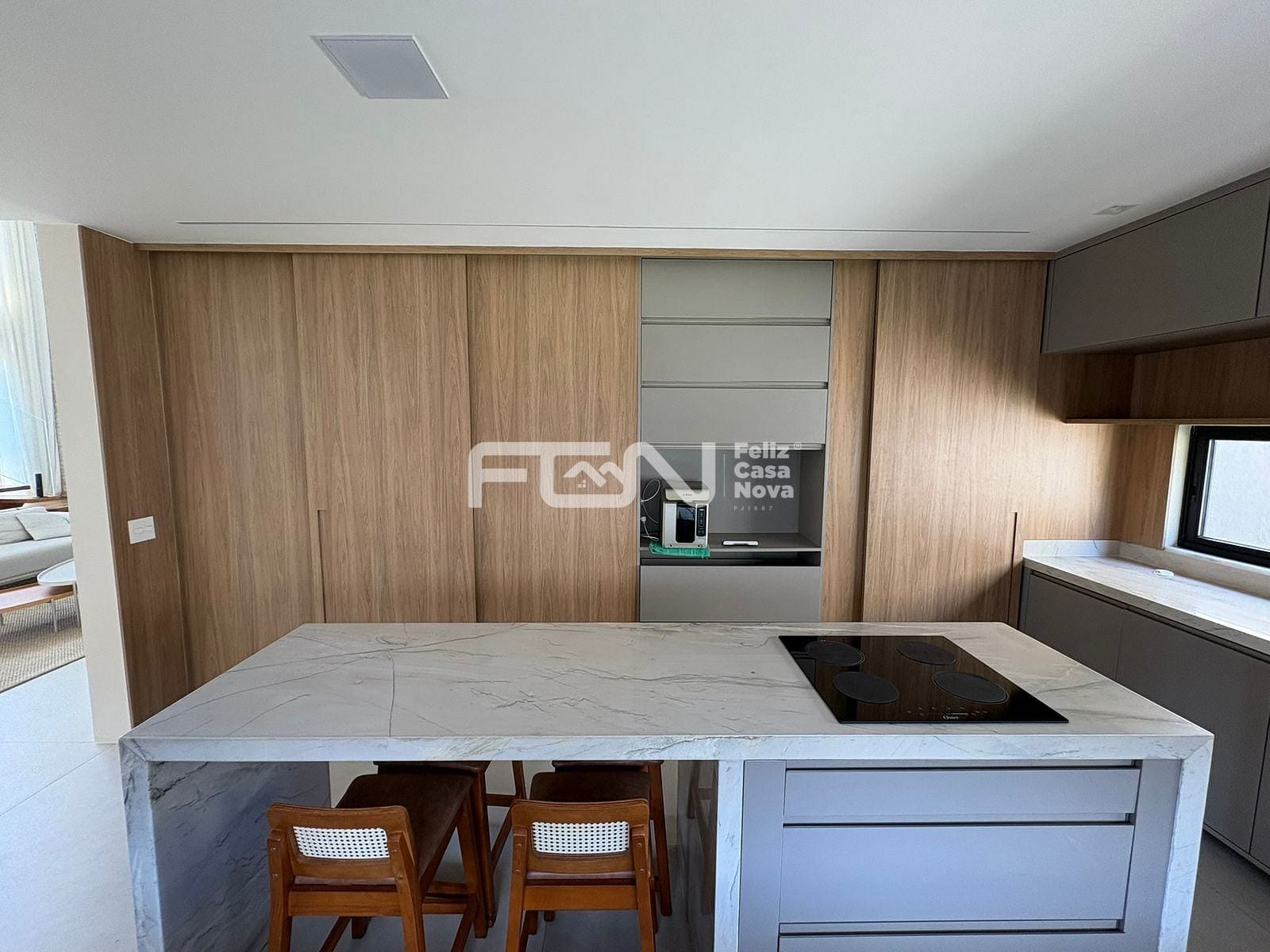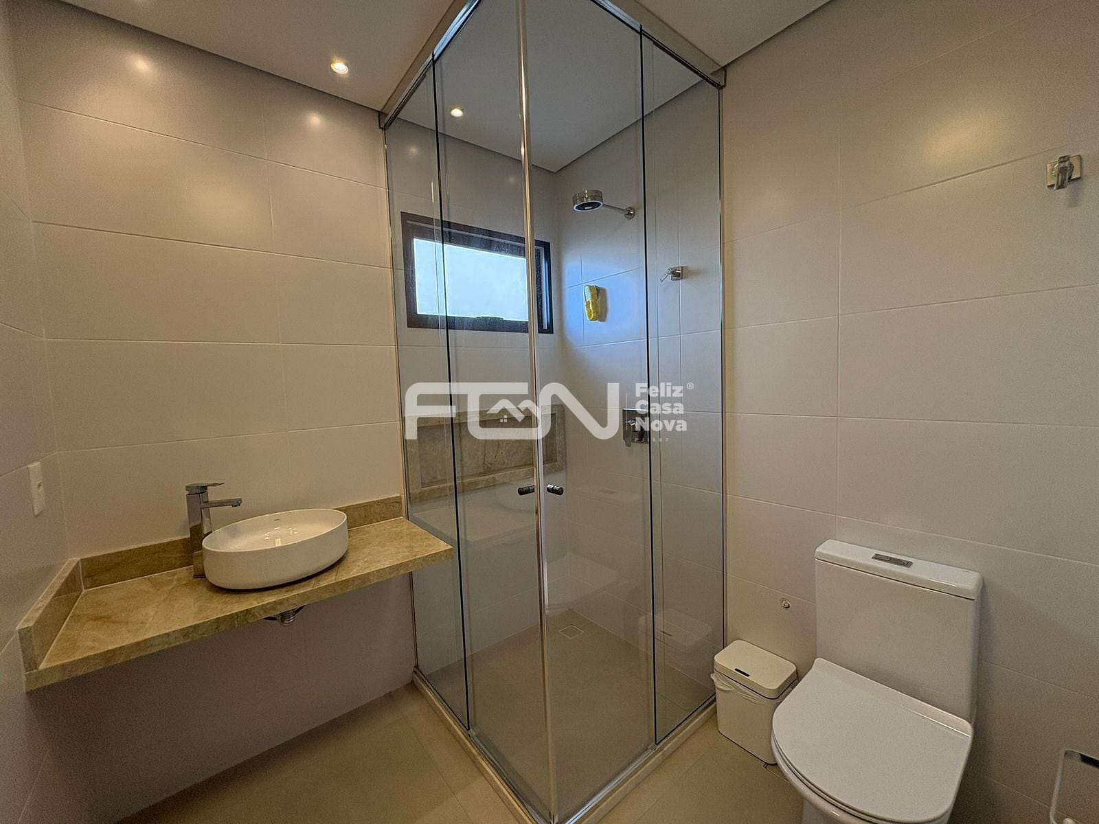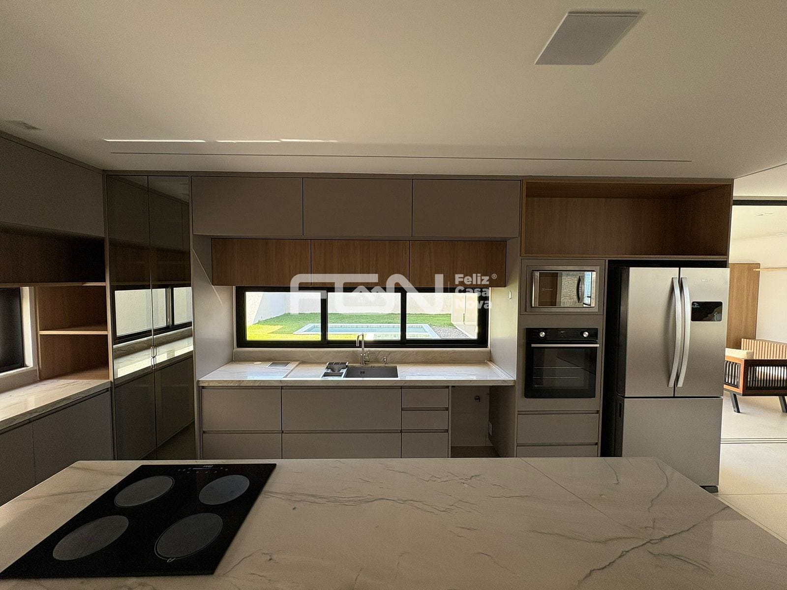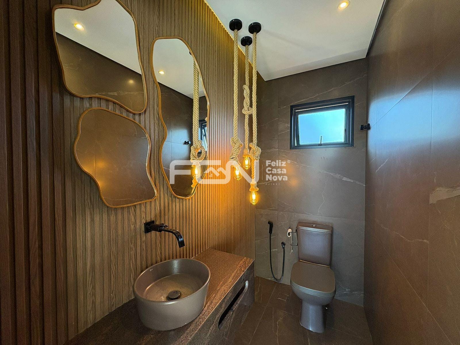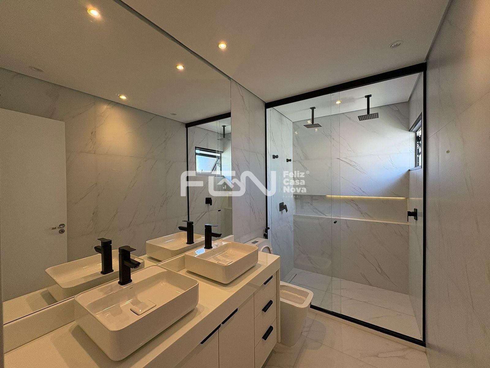 A casa possui sala com pé-direito duplo, além de cozinha completa, equipada com ilha, armários e cristaleira. Estão disponíveis também dois lavabos revestidos em mármore quartzito, dependência com banheiro, área de serviço e dispensa, garantindo praticidade no dia a dia.