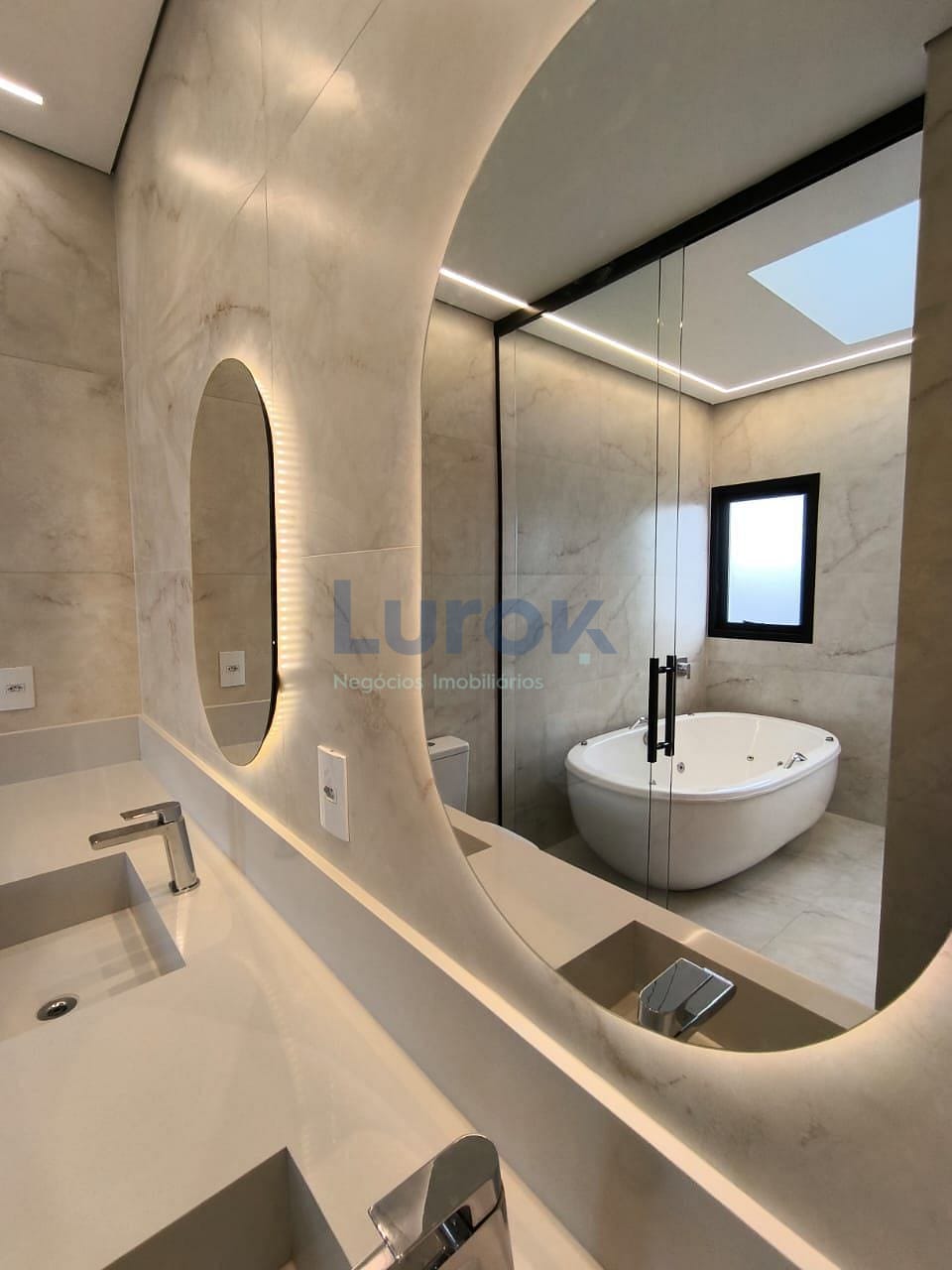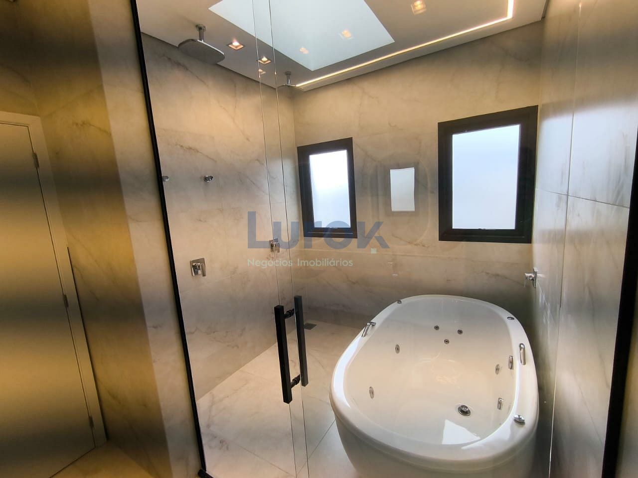 Banheiro tipo spa com banheira dupla, boxes até o teto, dois chuveiros de teto, e claraboia domus.