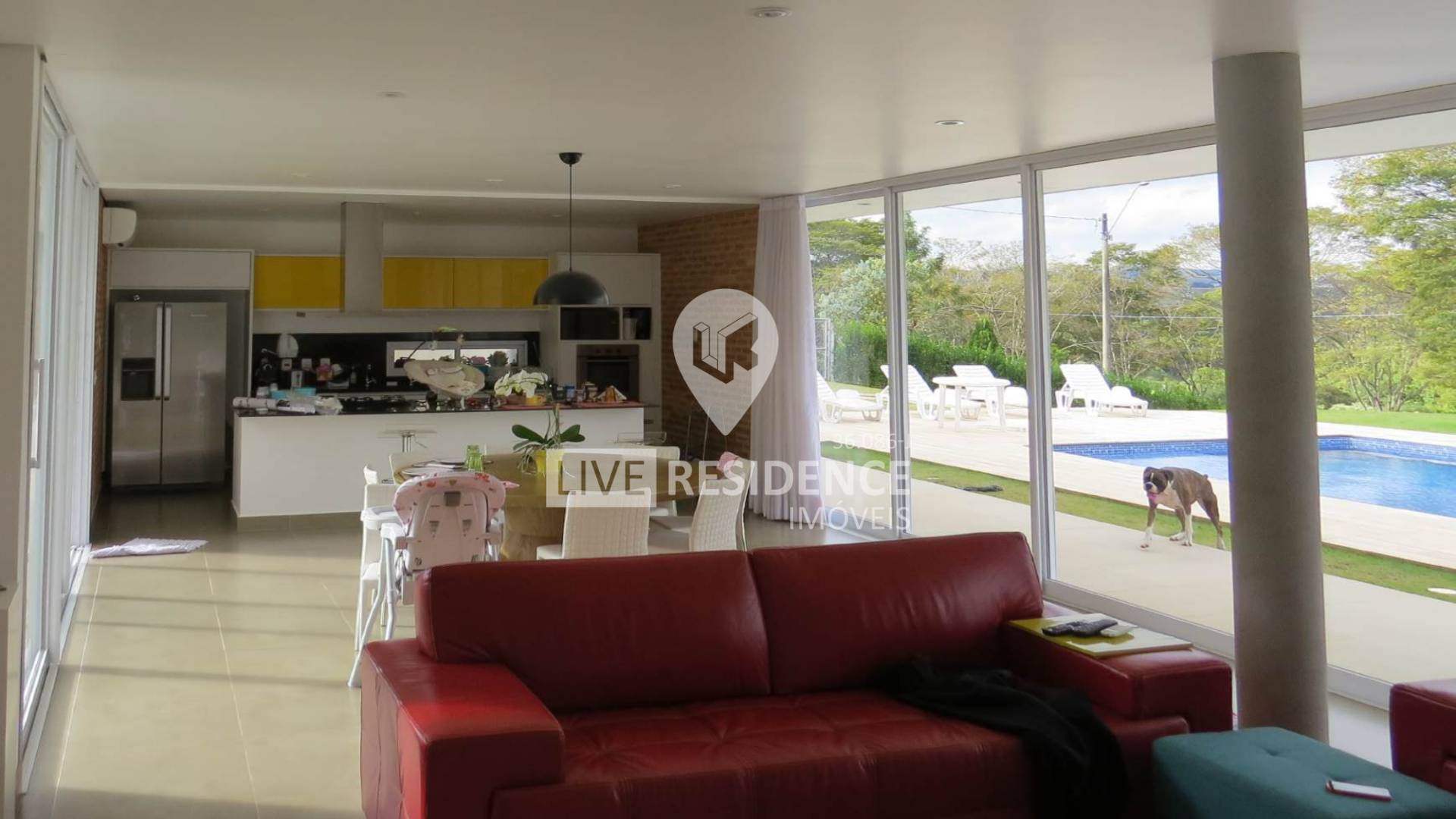 Sala em vários ambientes, integrada e cheia de luz natural