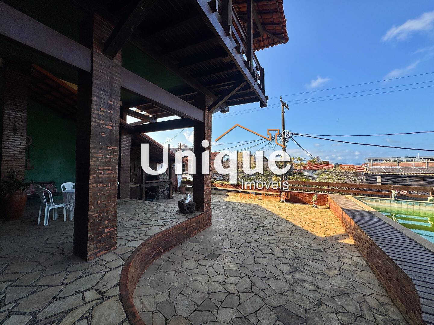 Composta por 04 quartos sendo 02 suítes, 06 banheiros, sala ampla, sala de jantar, cozinha americana com despensa, área de serviço, garagem para 03 carros, piscina de 36m3 com cascata, 02 duchas, churrasqueira e deck para barcos pequenos.