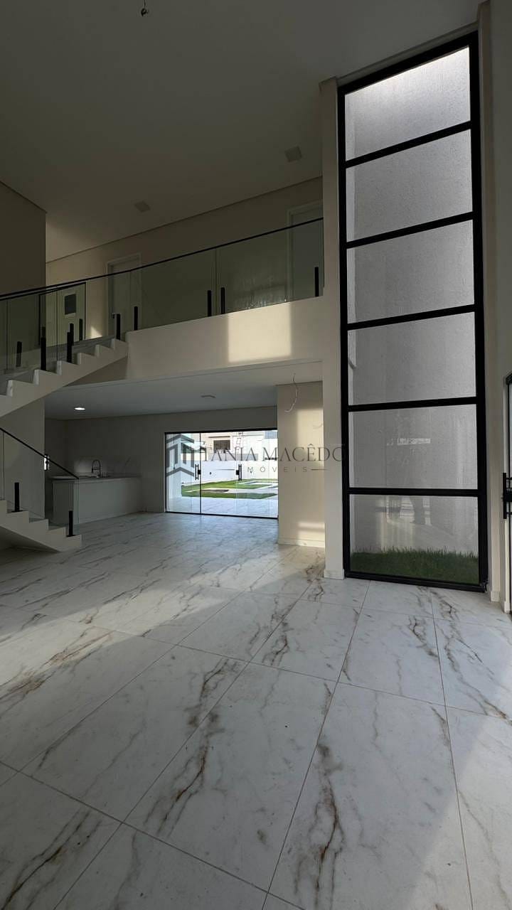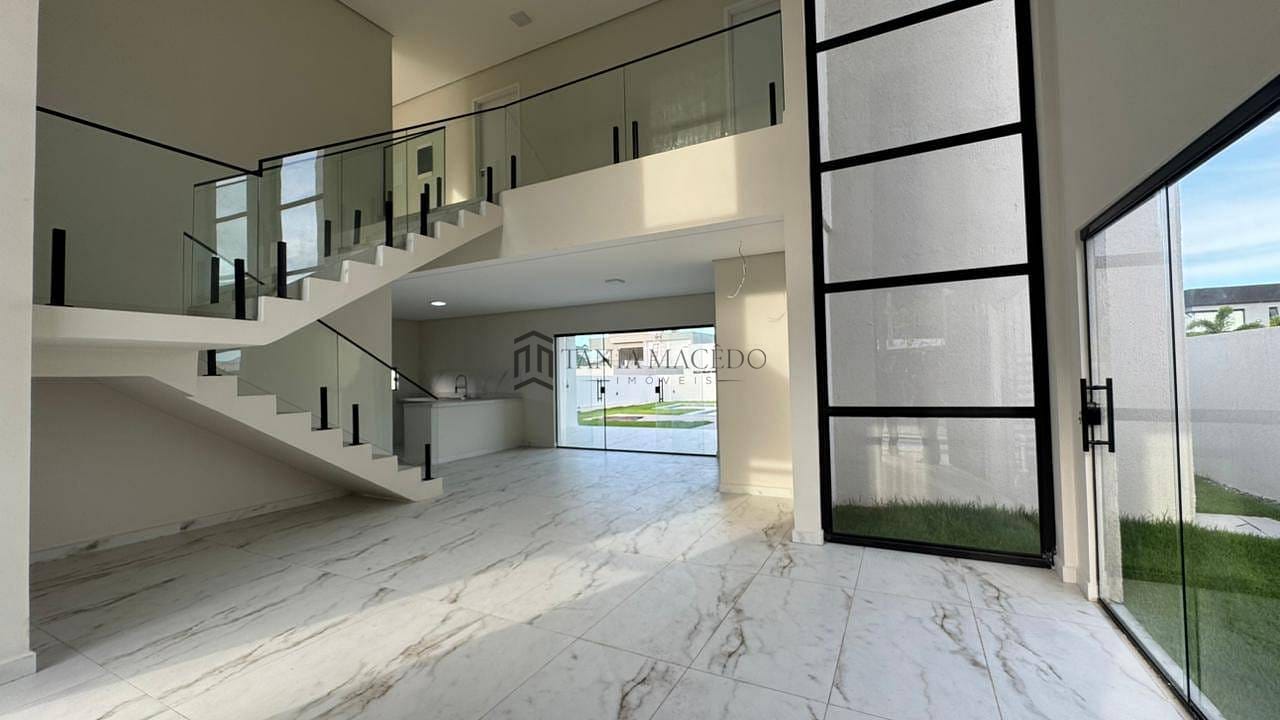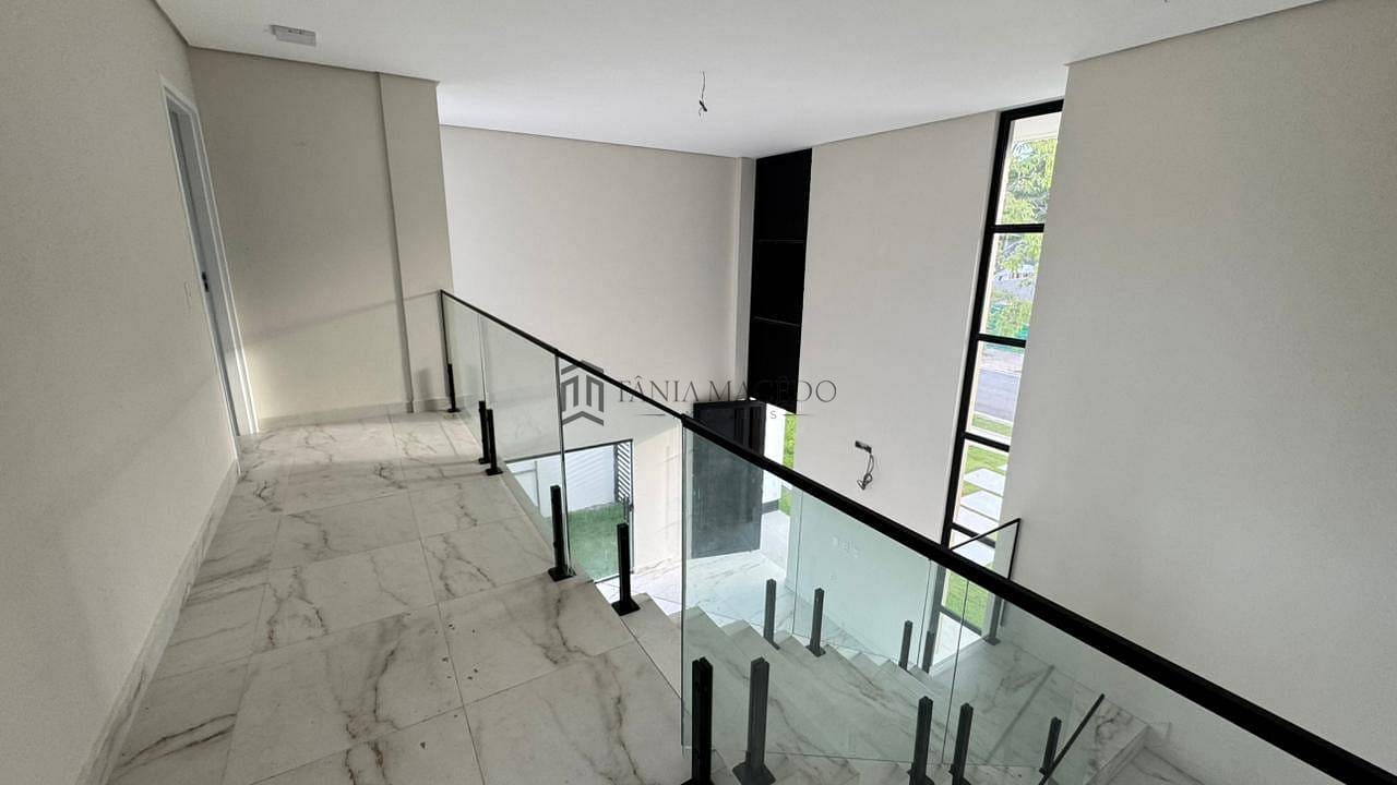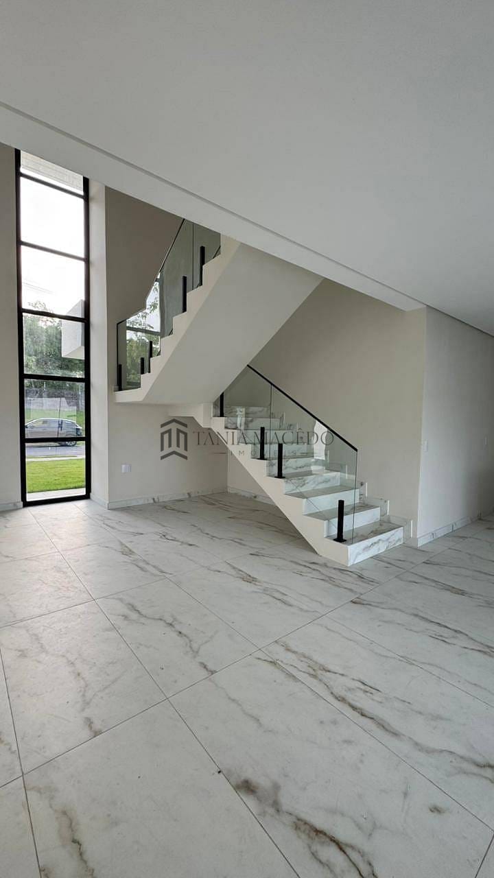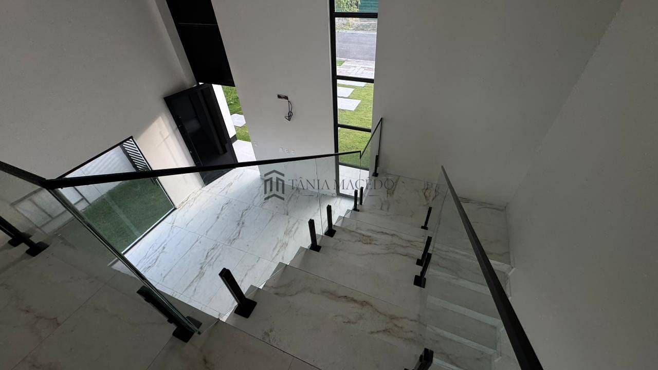 Pé-direito duplo na sala, com escadaria flutuante e guarda-corpo de vidro temperado