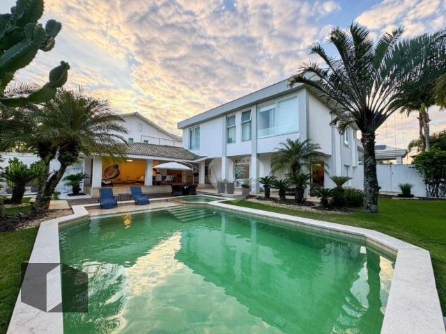 (Código: 61681, Rua Ariosto Berna) - Malibu. Condomínio de alto luxo com segurança e monitoramento 24h, lindos jardins e área de lazer, composta por quadra poliesportiva, quadra de tênis, churrasqueira e salão de festas com espaço gourmet. Excelente casa com jardim, piscina, sauna e confortável área gourmet com três ambientes distintos e churrasqueira. Composta no primeiro pavimento por salão em três ambientes, sala de TV , sala de jantar, varandão, lavabo, copacozinha planejada, área de serviço e lavanderia, duas despensas, mezanino e dependência completa. Escada de acesso ao segundo piso, seguido de quatro espaçosas suítes, sendo duas canadenses, todas com closet, a master com walking closet e banheiro com hidro. Espaço para quatro vagas cobertas.