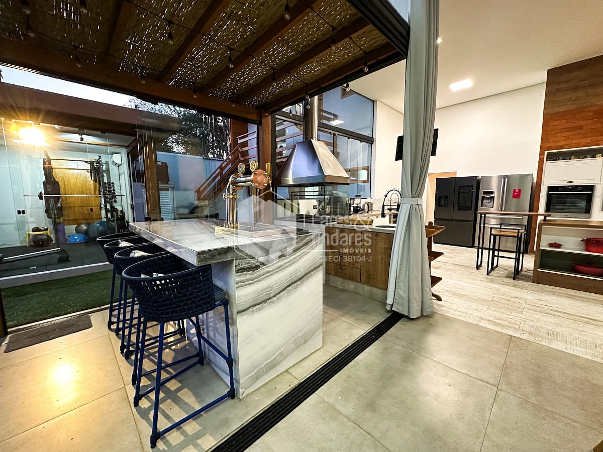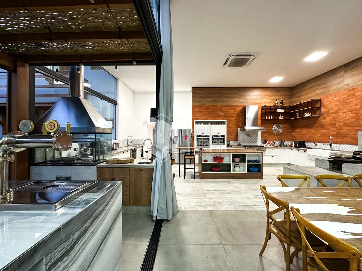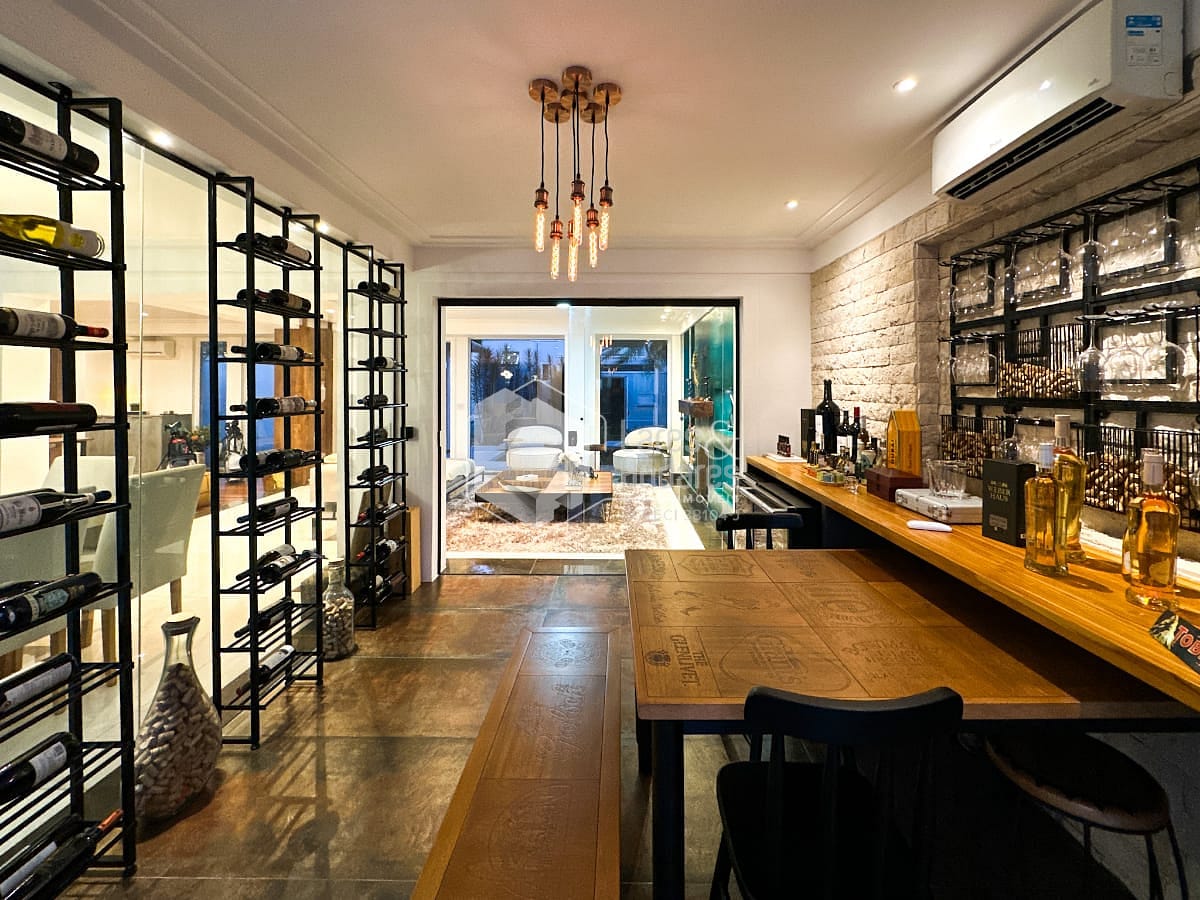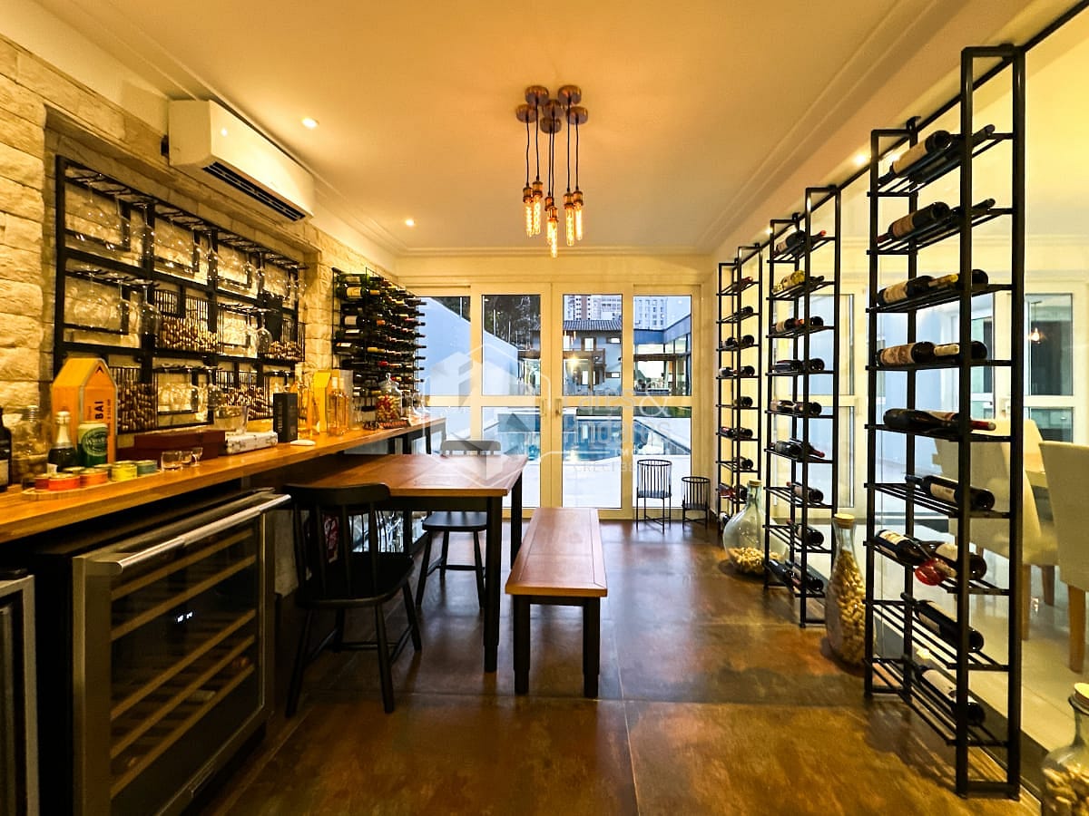 O anexo é um dos grandes destaques do imóvel. Com pé-direito imponente de 4,10 metros, foi pensado para o lazer em alto nível. Conta com sala de TV montada, cozinha sofisticada equipada com forno e micro-ondas Gorenje, além de fogão Brastemp Gourmand. Um fogão a lenha centralizado traz charme e aconchego ao ambiente. Uma despensa ampla e um sótão atendem perfeitamente essa área. A churrasqueira a carvão sob medida e a chopeira pronta para uso completam o espaço, todo ele climatizado com ar-condicionado central.