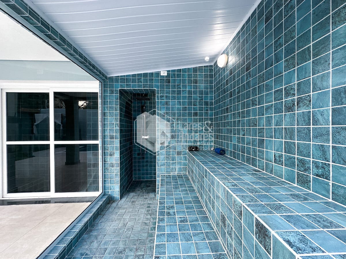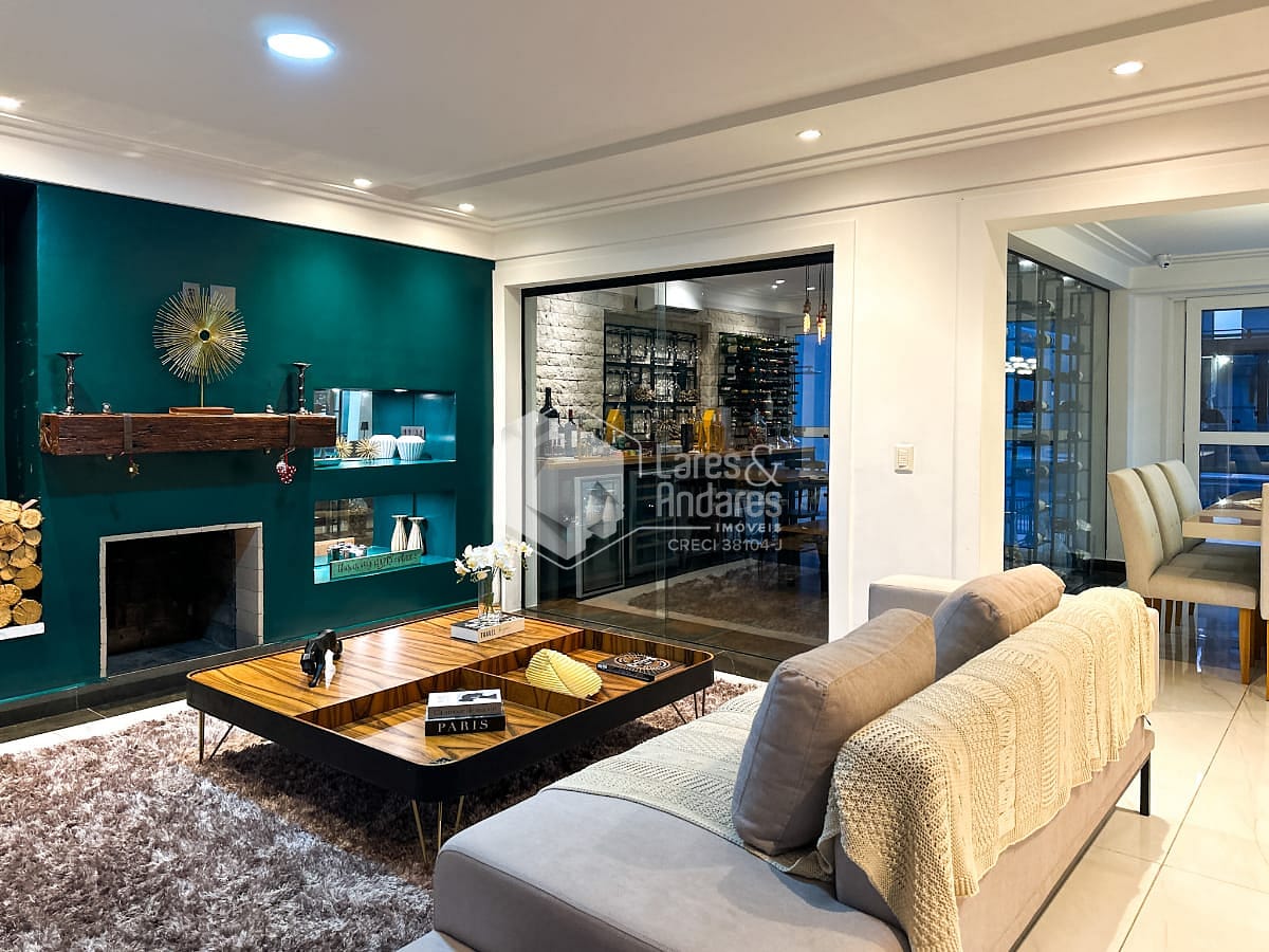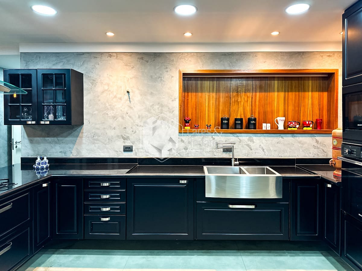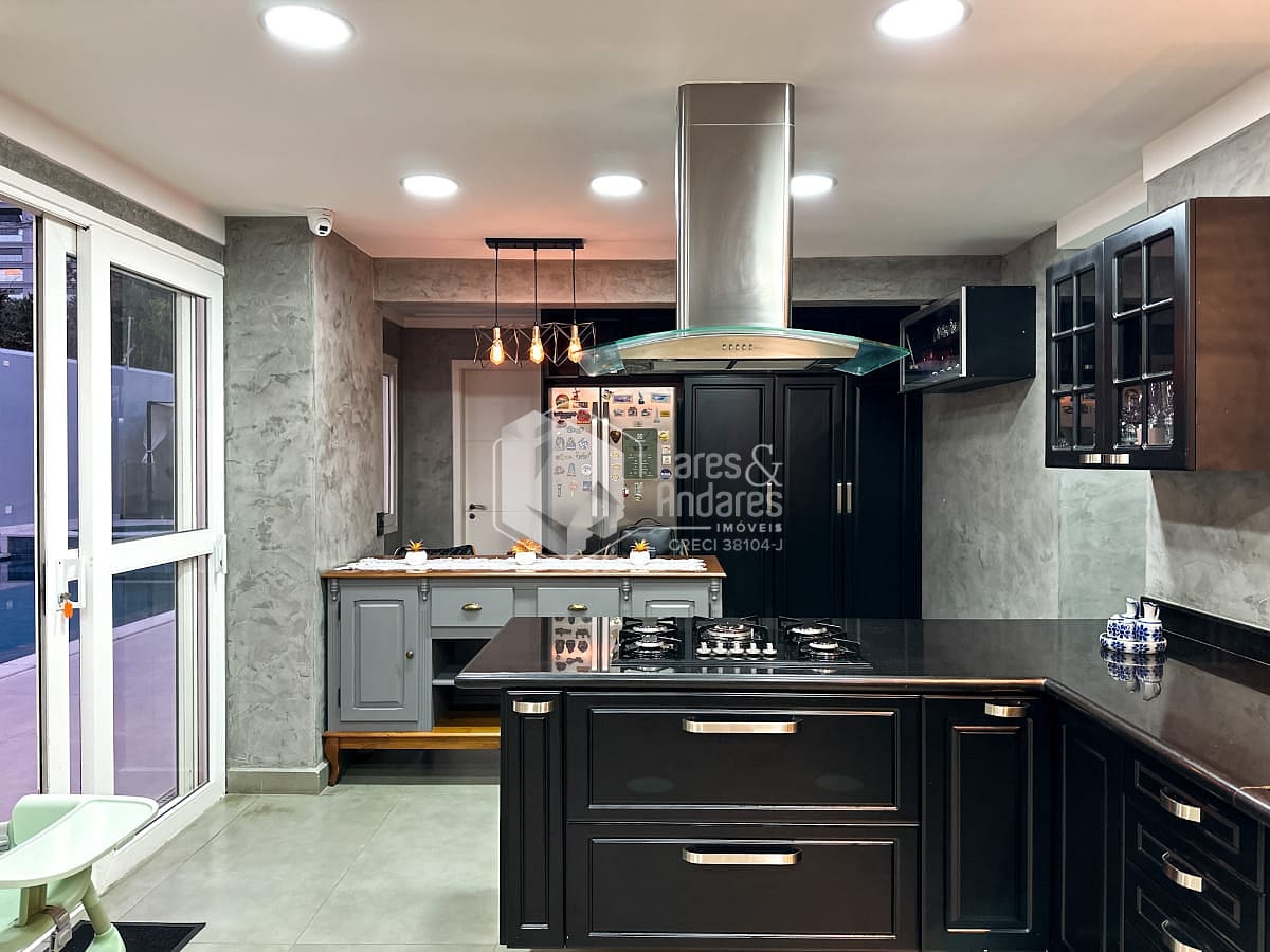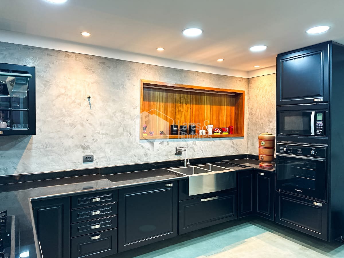 O anexo é um dos grandes destaques do imóvel. Com pé-direito imponente de 4,10 metros, foi pensado para o lazer em alto nível. Conta com sala de TV montada, cozinha sofisticada equipada com forno e micro-ondas Gorenje, além de fogão Brastemp Gourmand. Um fogão a lenha centralizado traz charme e aconchego ao ambiente. Uma despensa ampla e um sótão atendem perfeitamente essa área. A churrasqueira a carvão sob medida e a chopeira pronta para uso completam o espaço, todo ele climatizado com ar-condicionado central.