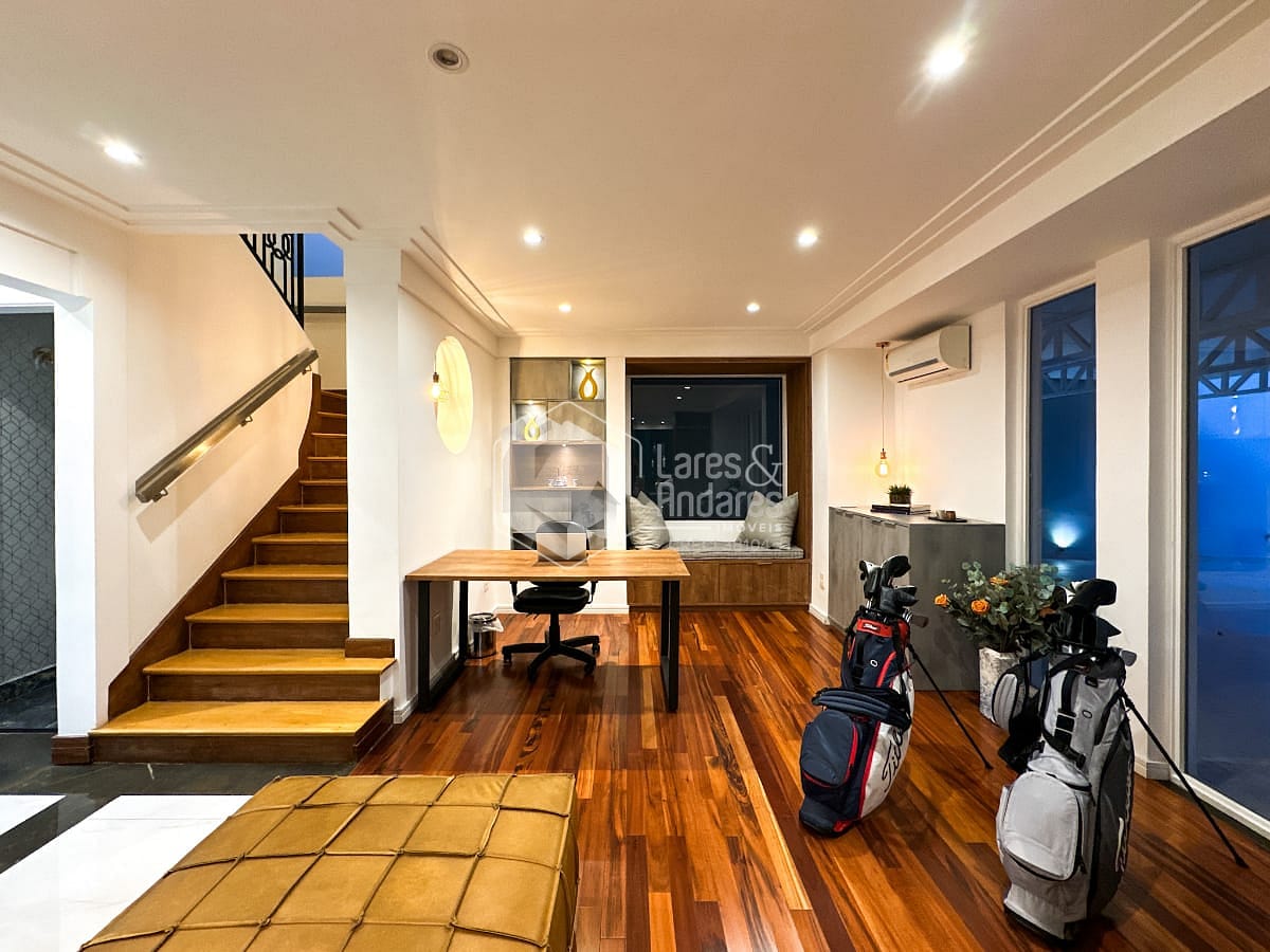 A casa principal abriga três suítes extremamente espaçosas, pensadas para conforto e privacidade. Duas delas contam com closets generosos e banheiros com banheira de hidromassagem, verdadeiros refúgios de descanso. A área social é ampla e convidativa, com uma adega climatizada ideal para receber e celebrar bons momentos. O escritório integra-se às salas de estar e jantar com elegância e funcionalidade. A cozinha é totalmente equipada e bem planejada, conectada a uma sala multifuncional. A lavanderia é completa, com ponto para secadora a gás, e um elevador plataforma atende os dois pavimentos da casa.