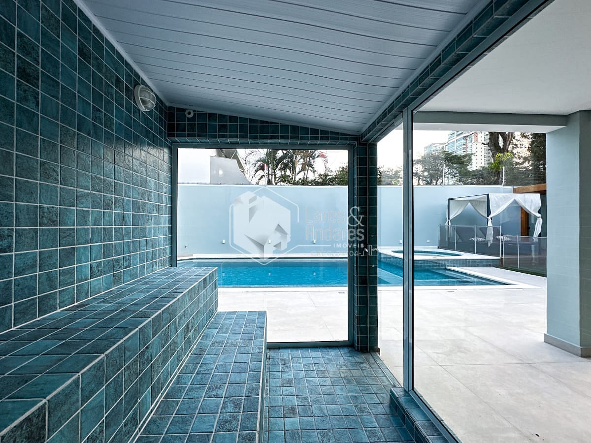 A área externa é igualmente encantadora, com piscina de desenho elegante, borda molhada e spa integrado. A piscina possui trocador de calor e o spa é aquecido a gás. O espaço de bem-estar é complementado por sauna seca e sauna úmida, além de uma academia equipada e climatizada.