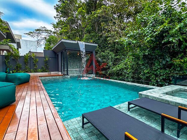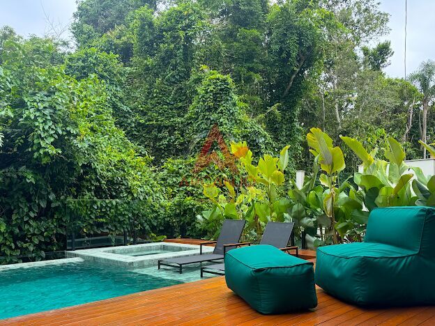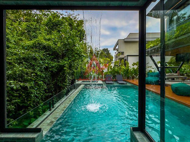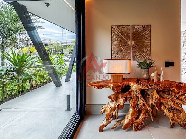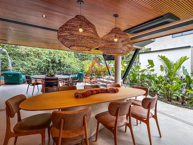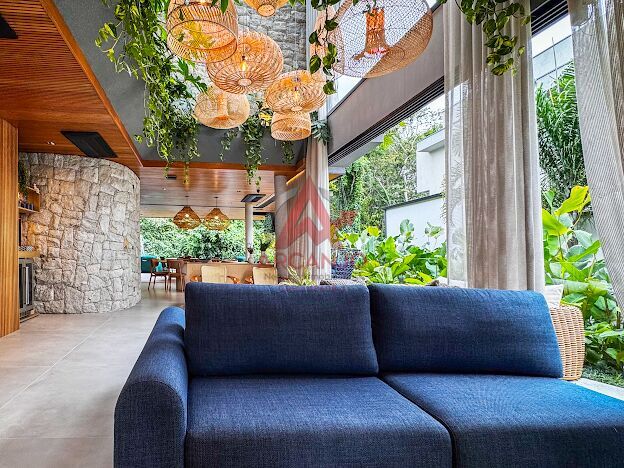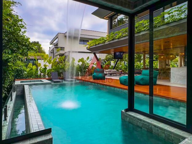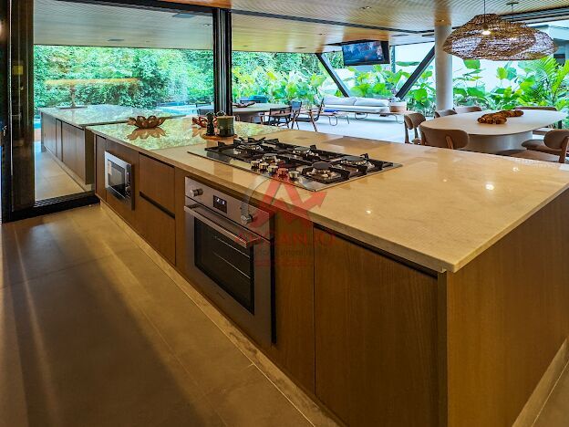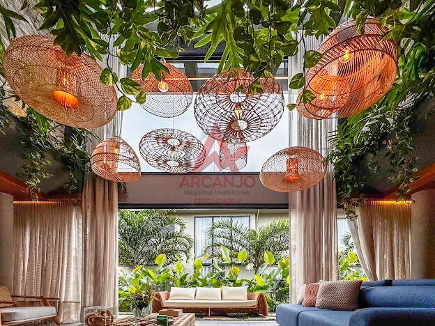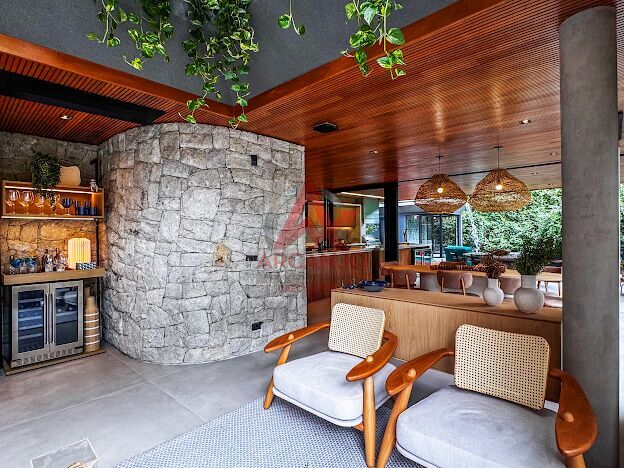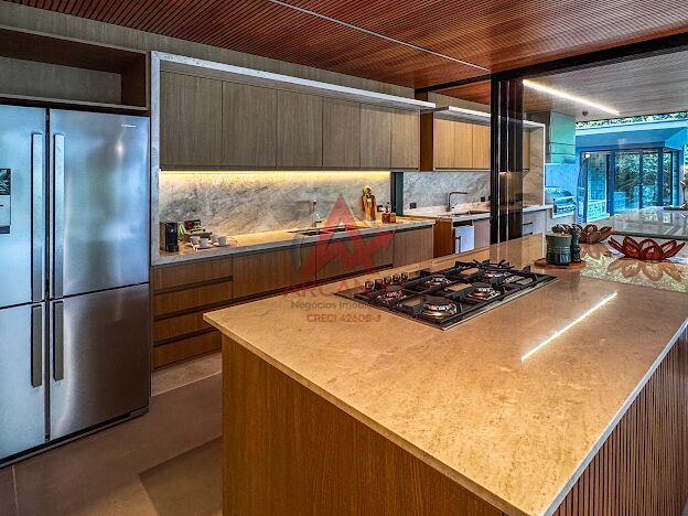 5 suítes no pavimento superior, sala de estar integrada aos jardins, cozinha integrada á área goumet completa com churrasqueora a gás e chopeira, piscina com borda infinita, spa de hidromassagem climatizado, sauna,