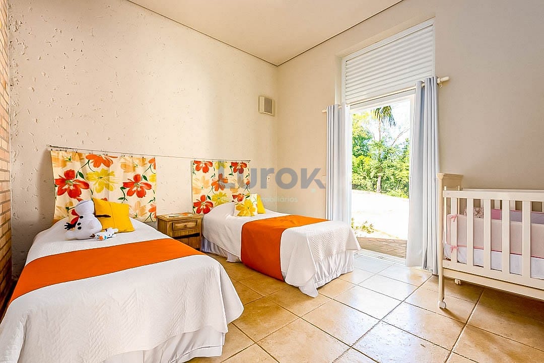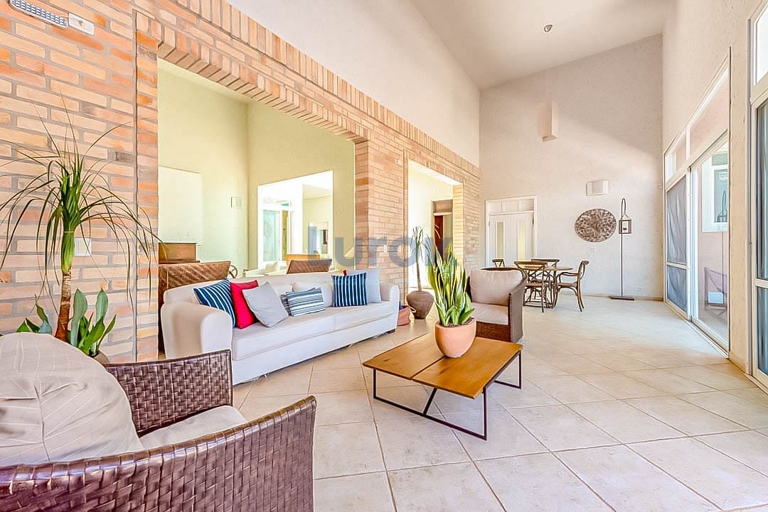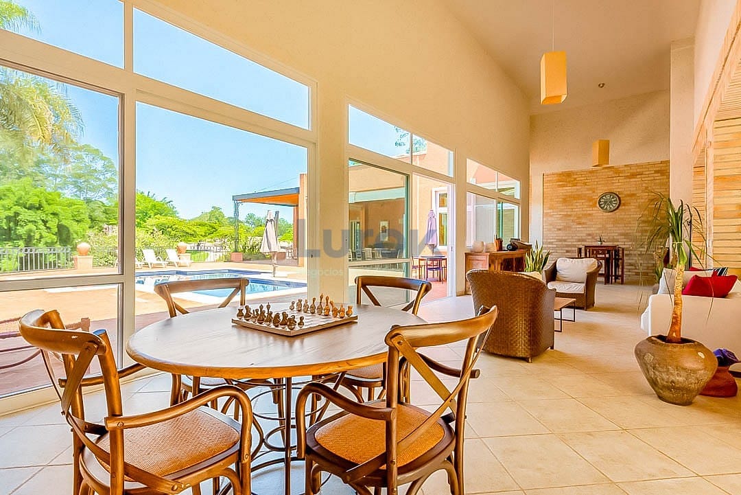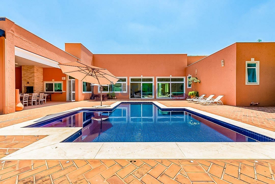 Bela Casa com o belíssimo jardim e a melhor vista do Campo de Golf! 5 amplas suítes, sala de estar , sala de jantar, escritório, sala de tv, roupeiro grande, cozinha, copa dispensa. 2 suítes para Funcionários, lavanderia, churrasqueira , quarto para depósito, banheiro ao lado da piscina , sauna e mais outro banheiro perto da sauna , um salão a disposição para montar uma academia. Piscina, gerador para funcionamento em 100 % capacidade full da casa, poço artesiano com vazão de 2 mil litros hora, churrasqueira, depósito, garagem coberta para 3 carros, energia solar, irrigação automática e reserva de água de 5 mil litros.