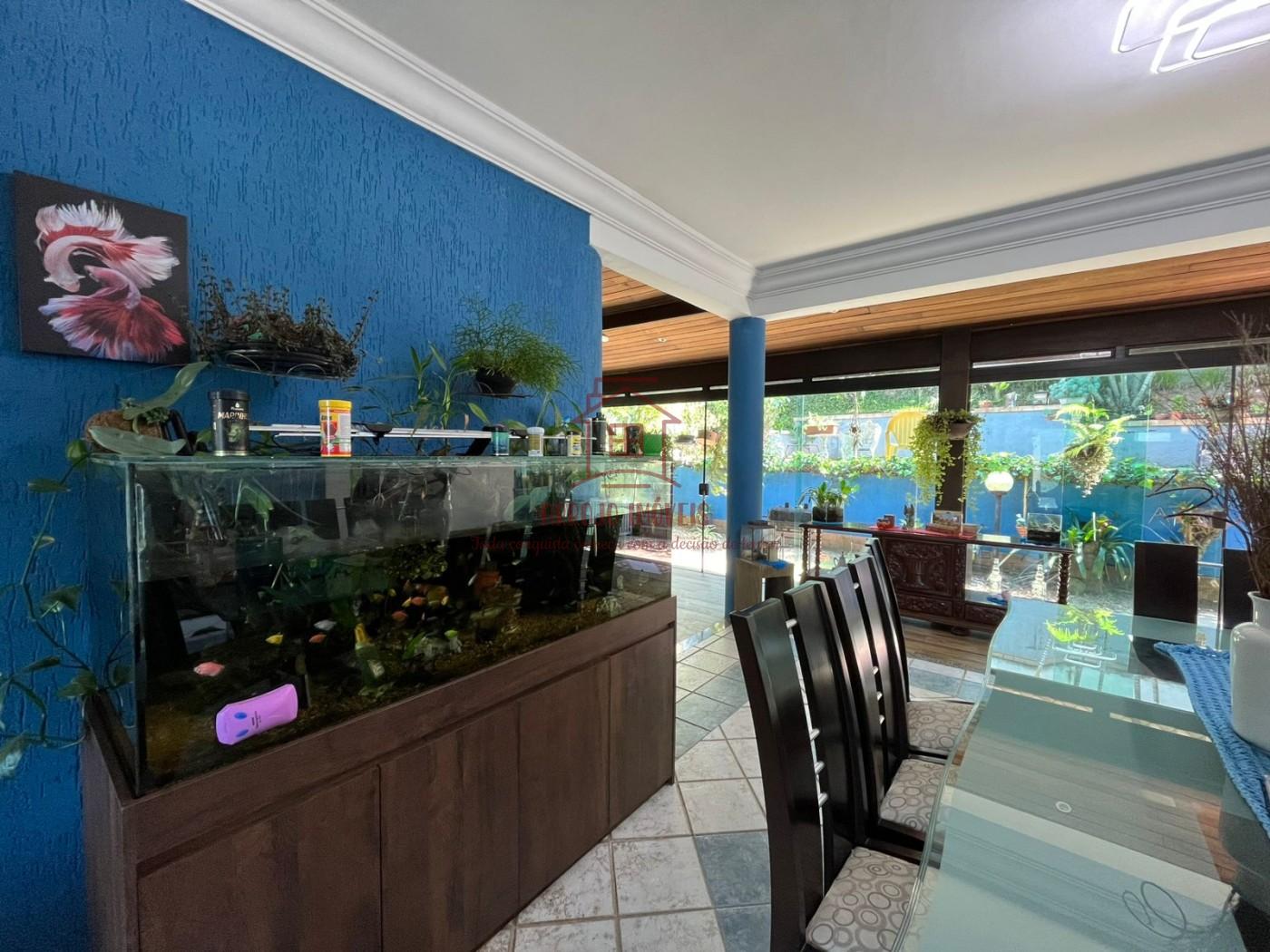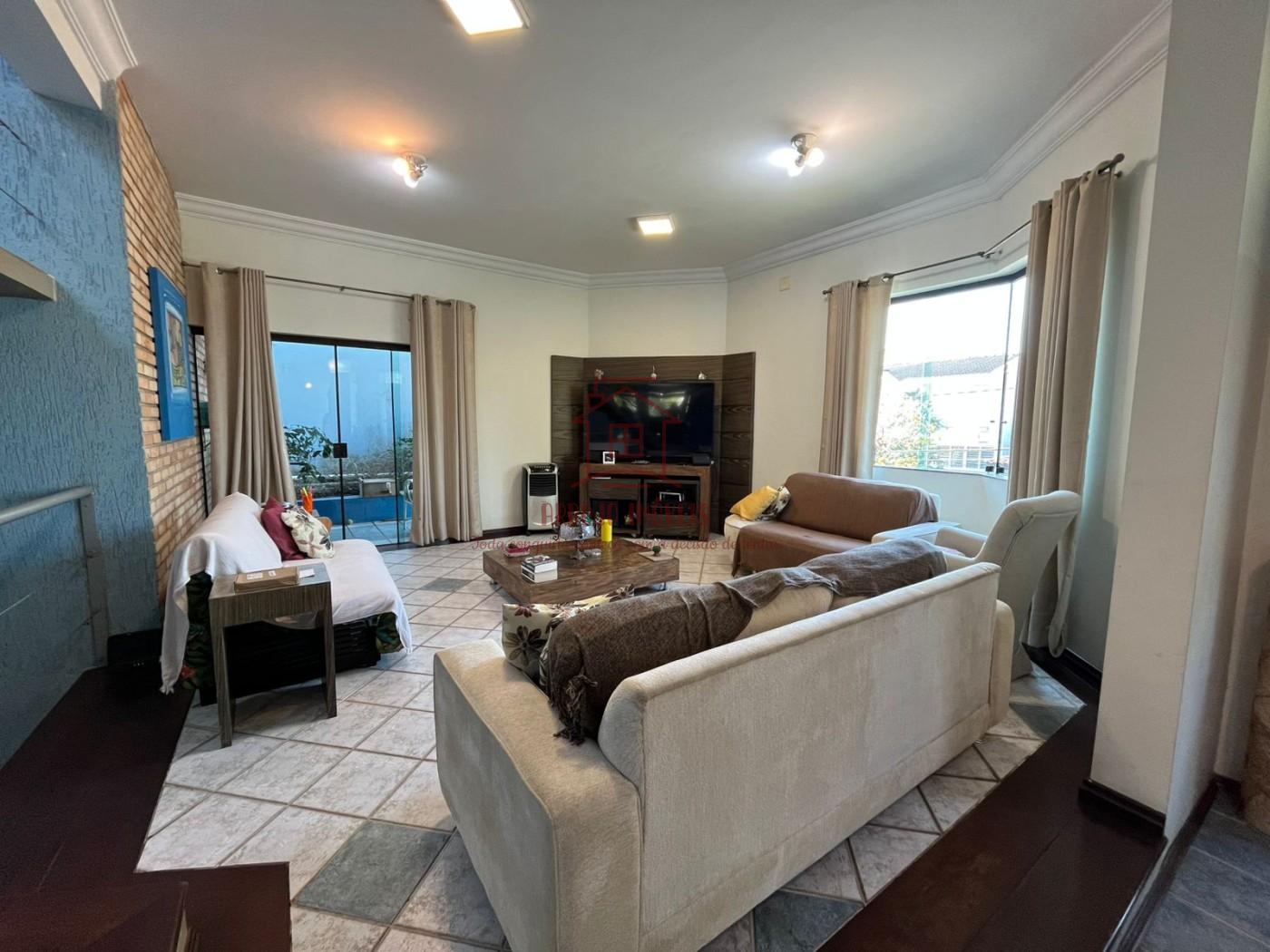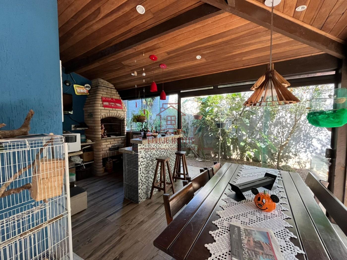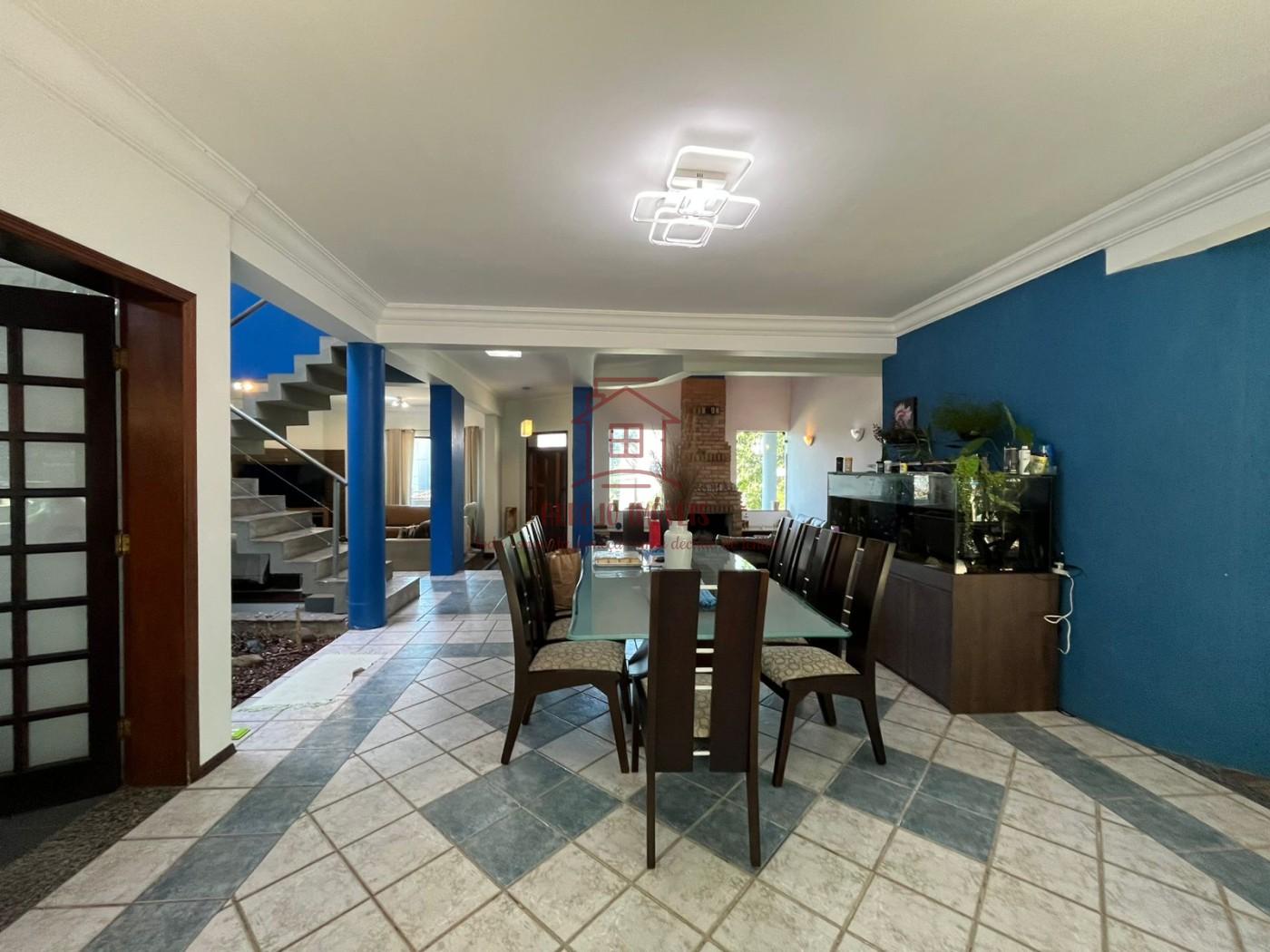 Características do imóvel: 5 dormitórios, sendo 3 suítes, 2 banheiros sociais adicionais, 3 vagas de garagem coberta com entrada e saída interna, oferecendo mais praticidade e segurança, 2 salas de estar, uma delas com pé-direito alto e lareira em alvenaria, Sala de TV espaçosa, com janelas amplas e muita iluminação natural, Sala de jantar com espaço para 8 lugares, Cozinha funcional com acesso direto ao quintal, Piso cerâmico decorado, sancas em gesso e detalhes em tijolo aparente, 1 escritório ao lado da sala de estar.