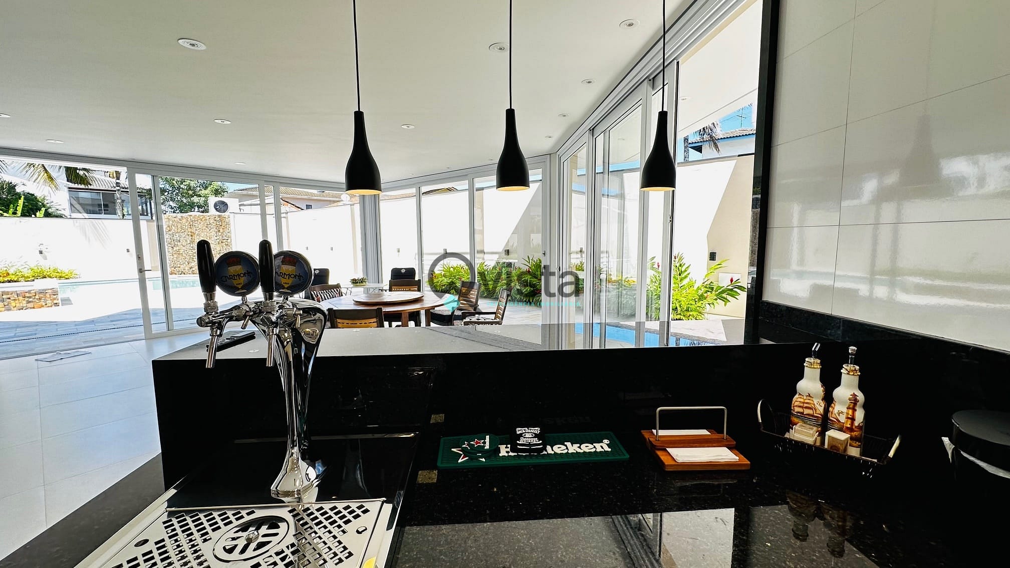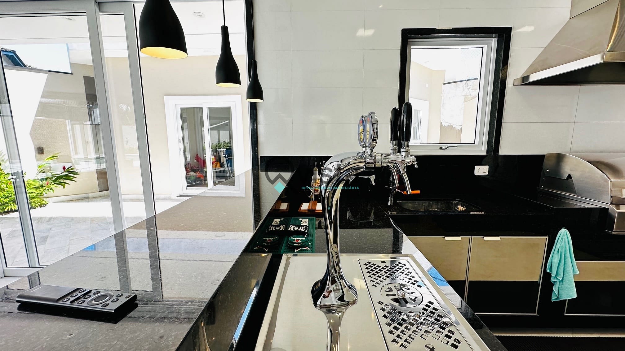 Sala de jantar com forno de pizza e chopeira;