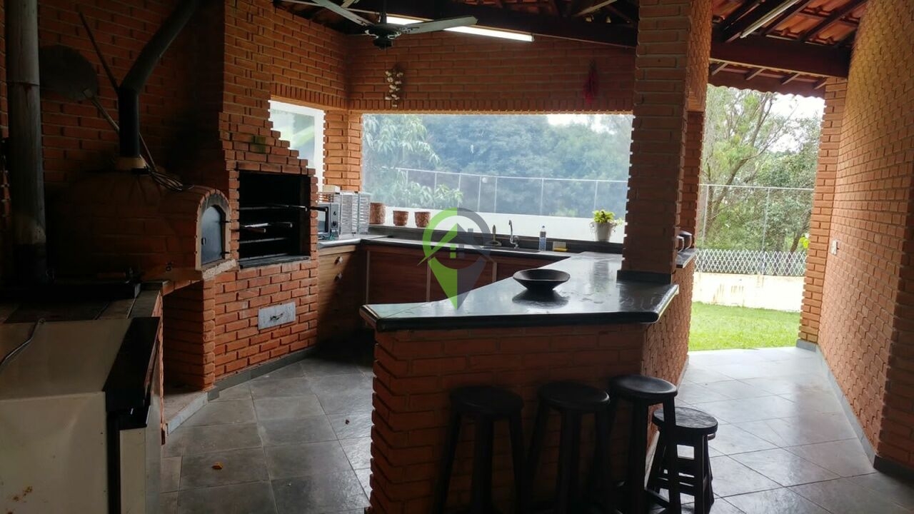 Área gourmet com balcão e armários, fogão de lenha, forno a lenha e churrasqueira.