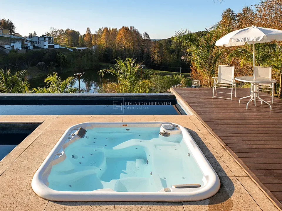 Piso superior: sala de TV + 3 suítes amplas com ar-condicionado e armários, sendo uma com varanda, outra com hidromassagem e a suíte máster com cozinha de apoio, varanda com vista para o lago, closet espetacular e sala de banho com jacuzzi.