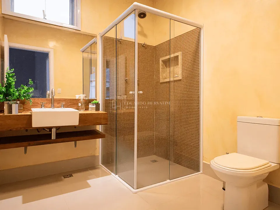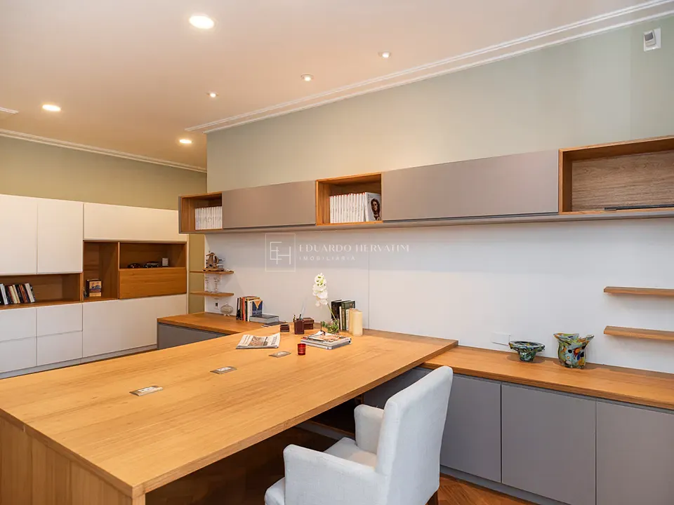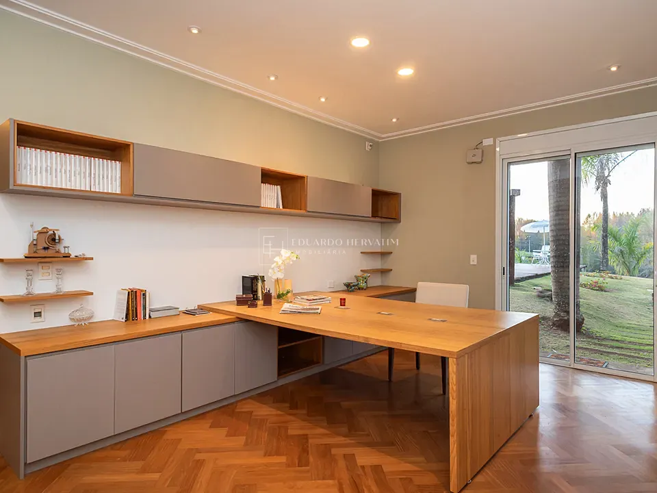 Piso inferior: escritório com saída para o jardim + 2 suítes completas, com ar-condicionado, armários e integração ao verde.