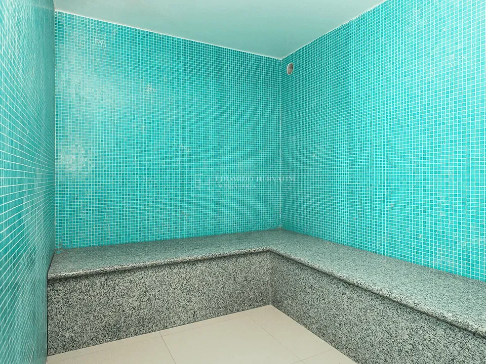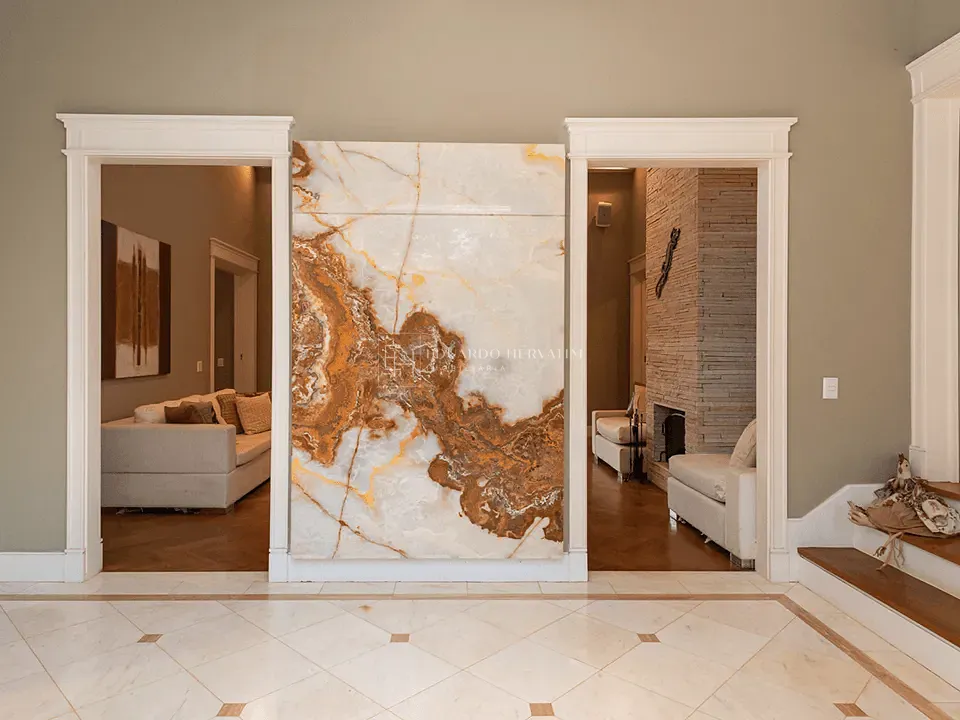Logo na entrada, o cenário impressiona com uma cascata, lago artificial e paisagismo exuberante, criando uma atmosfera de sofisticação e tranquilidade. O hall de entrada, em ônix paquistanês com iluminação indireta, dá o tom da elegância presente em todos os ambientes.