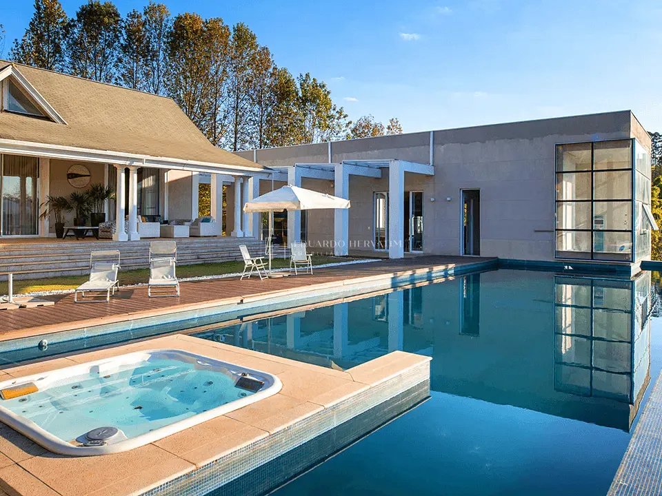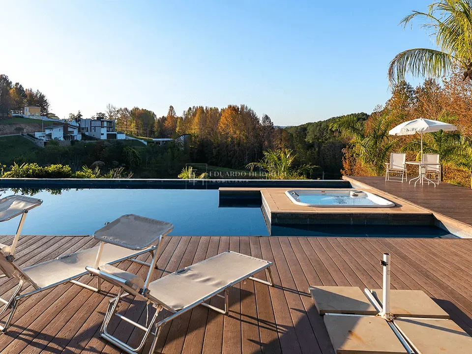 Piscina semiolímpica de 25m com borda infinita, aquecimento solar, hidromassagem externa e vista deslumbrante.