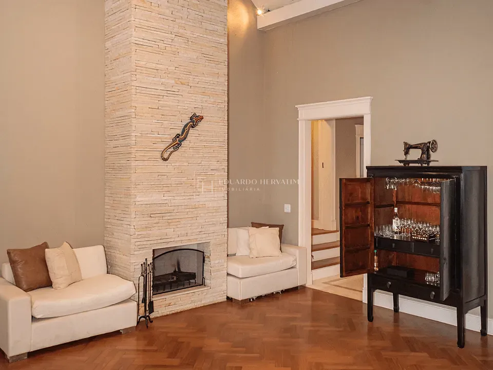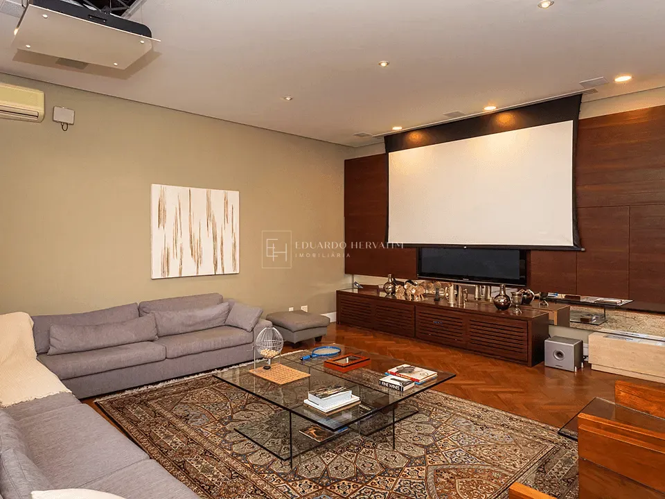 Ampla sala de estar integrada com lareira, almoço, jantar e home theater com telão de 103 e TV de 65, todos cercados por vidro com vista panorâmica.